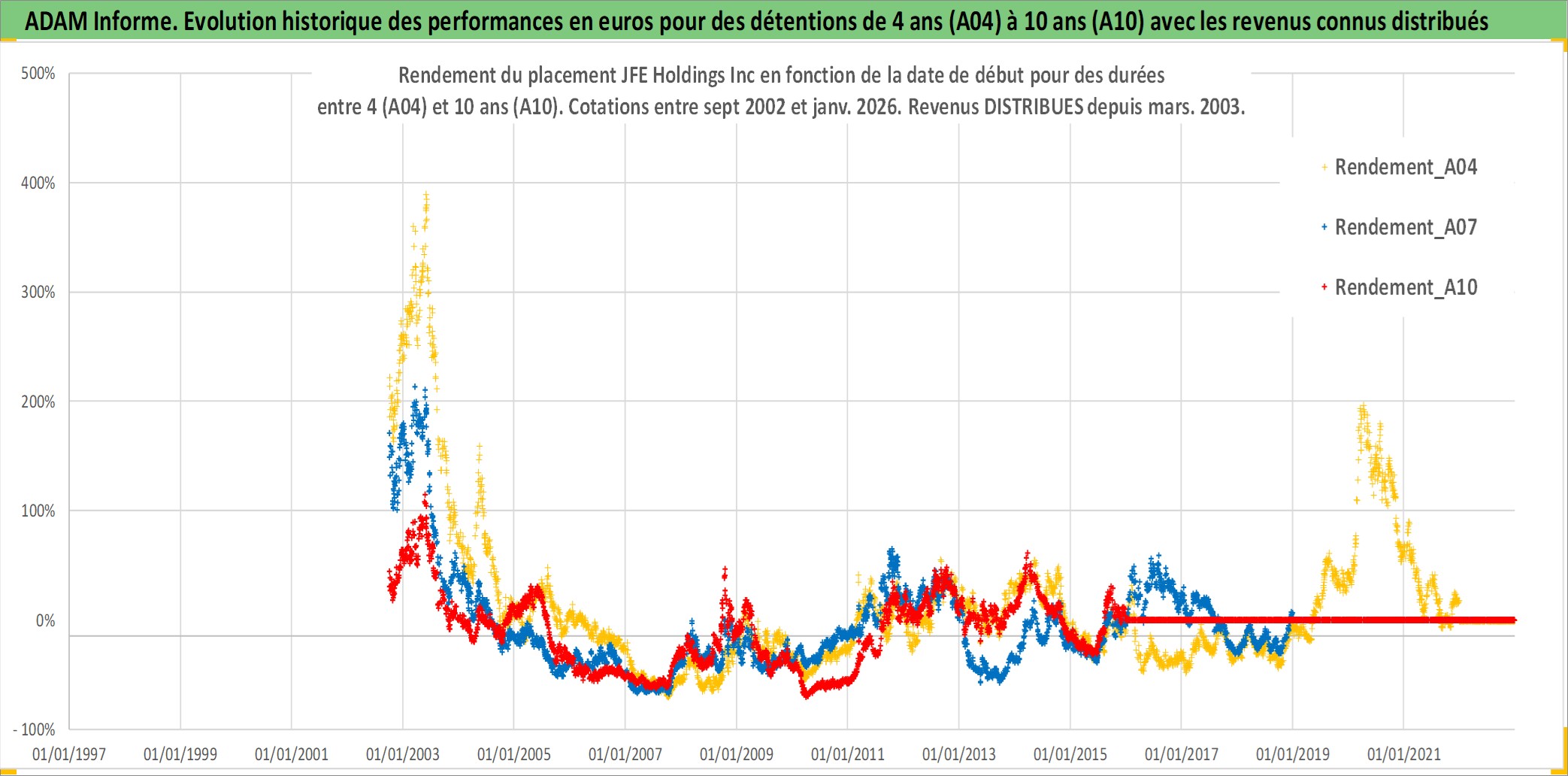 Site dédié aux investisseursPage dédiée sur site financeAnalyse des valorisations hebdomadaires de l'action JFE Holdings Inc. Cet actif est cote en JPY. Les valorisations sont en contrevaleur EURO et couvrent les semaines 2002W39 a 2026W01. Les revenus de cet actif financier sont pris en compte depuis la semaine 2003W13. La note globale ESG de cet actif est estimee a 3.0 (apres rebasage entre 0 et 20).