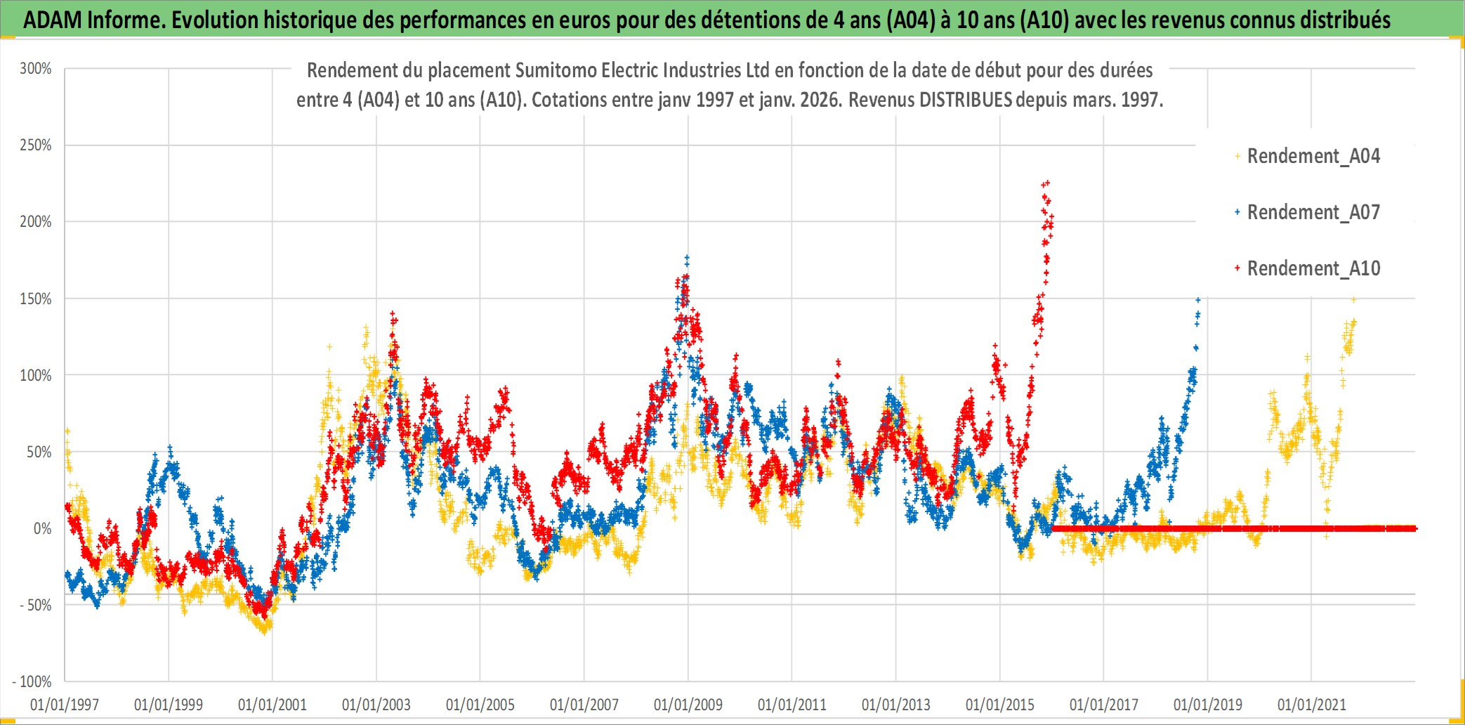 Site dédié aux investisseursPage dédiée sur site financeAnalyse des valorisations hebdomadaires de l'action Sumitomo Electric Industries Ltd. Cet actif est cote en JPY. Les valorisations sont en contrevaleur EURO et couvrent les semaines 1997W01 a 2026W01. Les revenus de cet actif financier sont pris en compte depuis la semaine 1997W13. La note globale ESG de cet actif est estimee a 8.0 (apres rebasage entre 0 et 20).