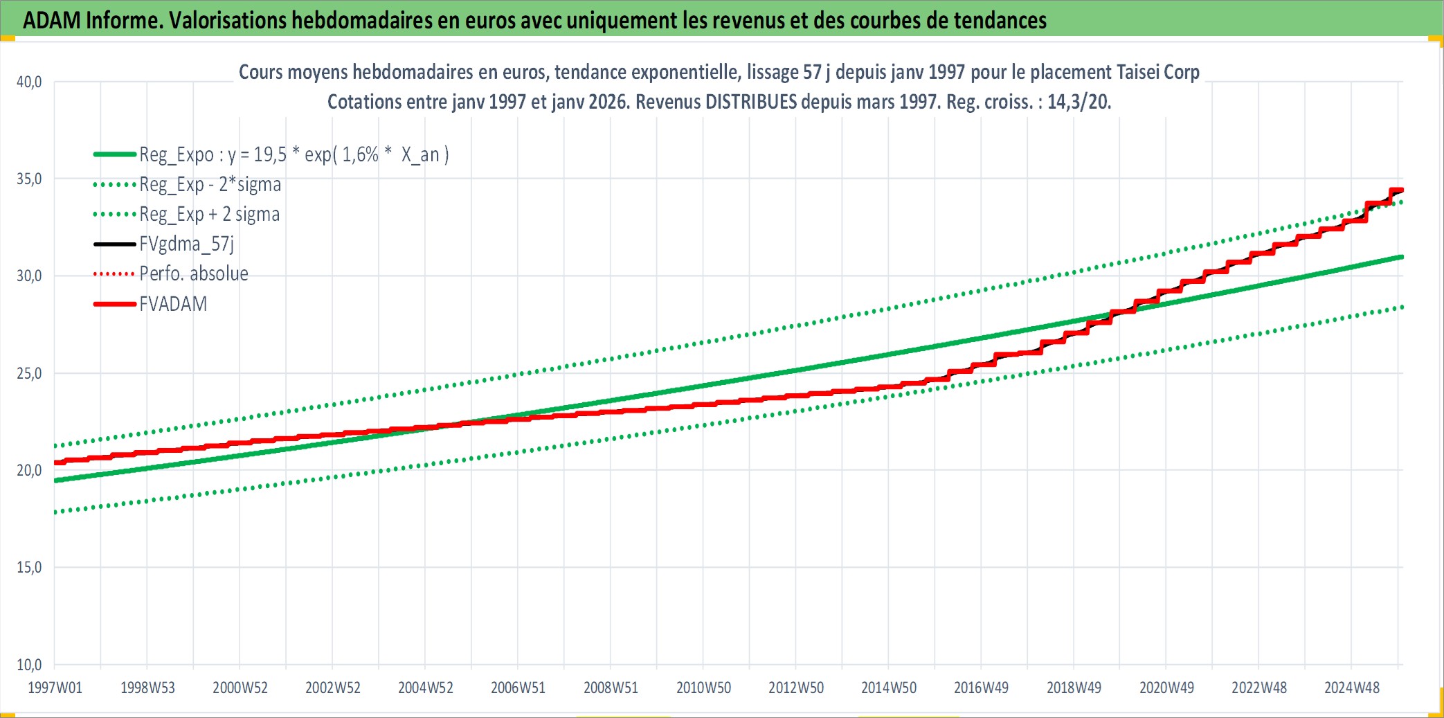 Site dédié aux investisseursPage dédiée sur site financeAnalyse des valorisations hebdomadaires de l'action Taisei Corp. Cet actif est cote en JPY. Les valorisations sont en contrevaleur EURO et couvrent les semaines 1997W01 a 2026W01. Les revenus de cet actif financier sont pris en compte depuis la semaine 1997W13. La note globale ESG de cet actif est estimee a 6.0 (apres rebasage entre 0 et 20).