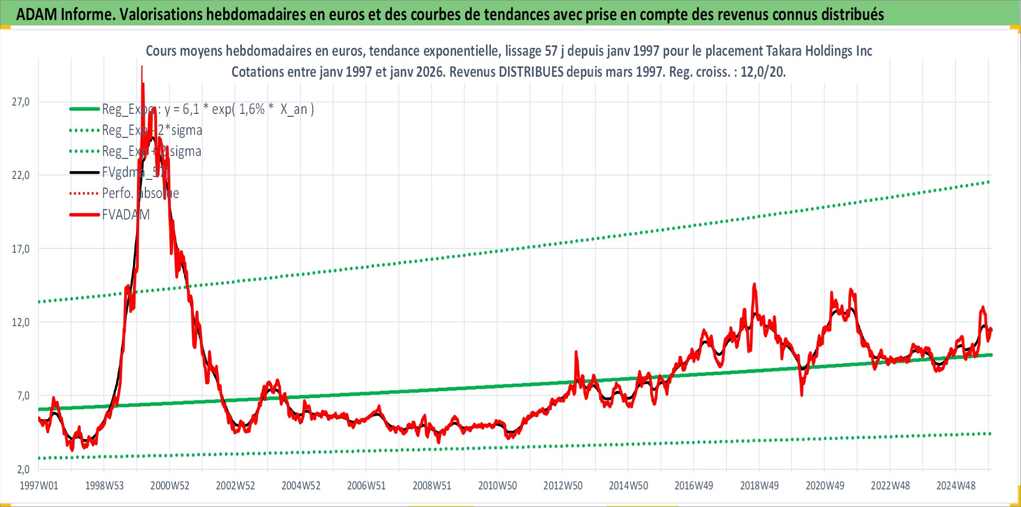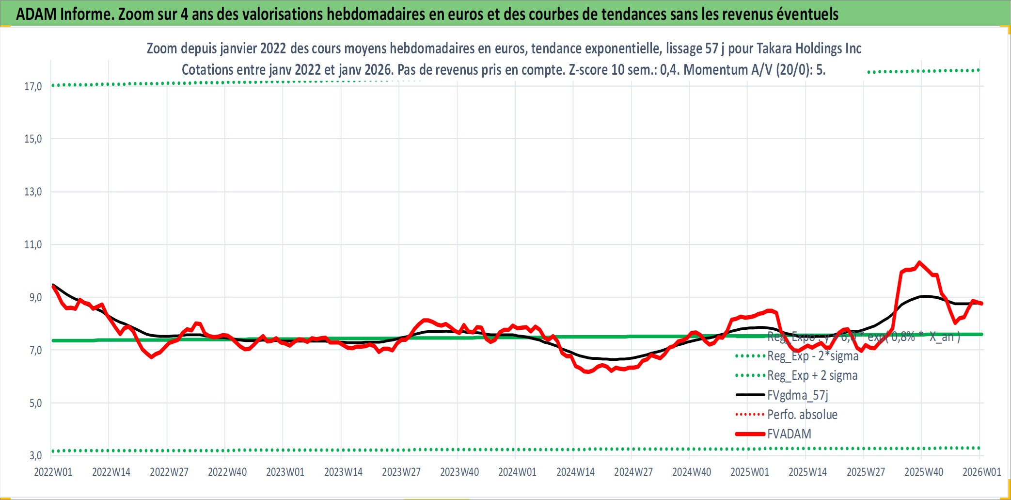 Site dédié aux investisseursPage dédiée sur site financeAnalyse des valorisations hebdomadaires de l'action Takara Holdings Inc. Cet actif est cote en JPY. Les valorisations sont en contrevaleur EURO et couvrent les semaines 1997W01 a 2026W01. Les revenus de cet actif financier sont pris en compte depuis la semaine 1997W13. La note ESG de cet actif n'est pas connue.