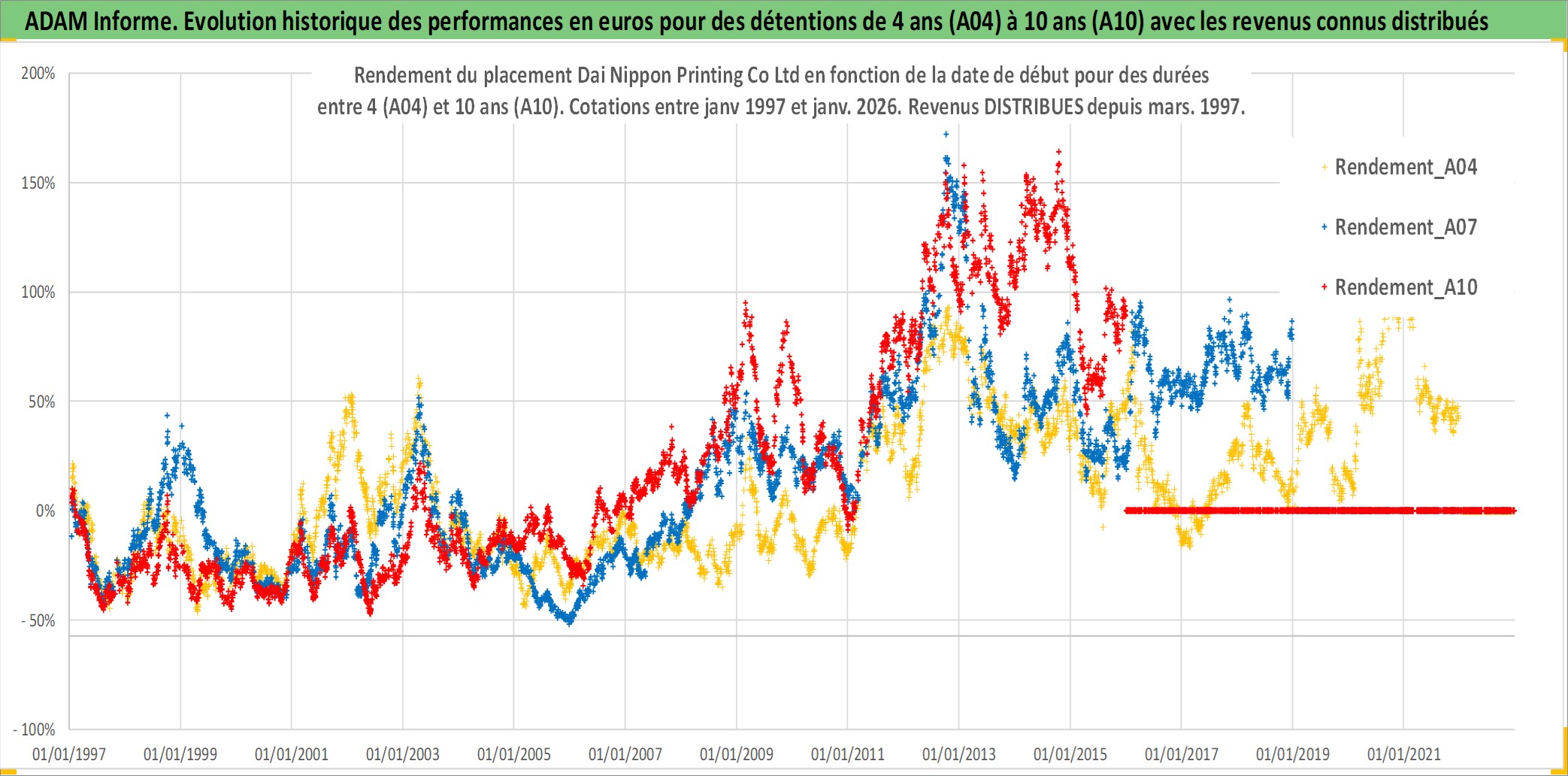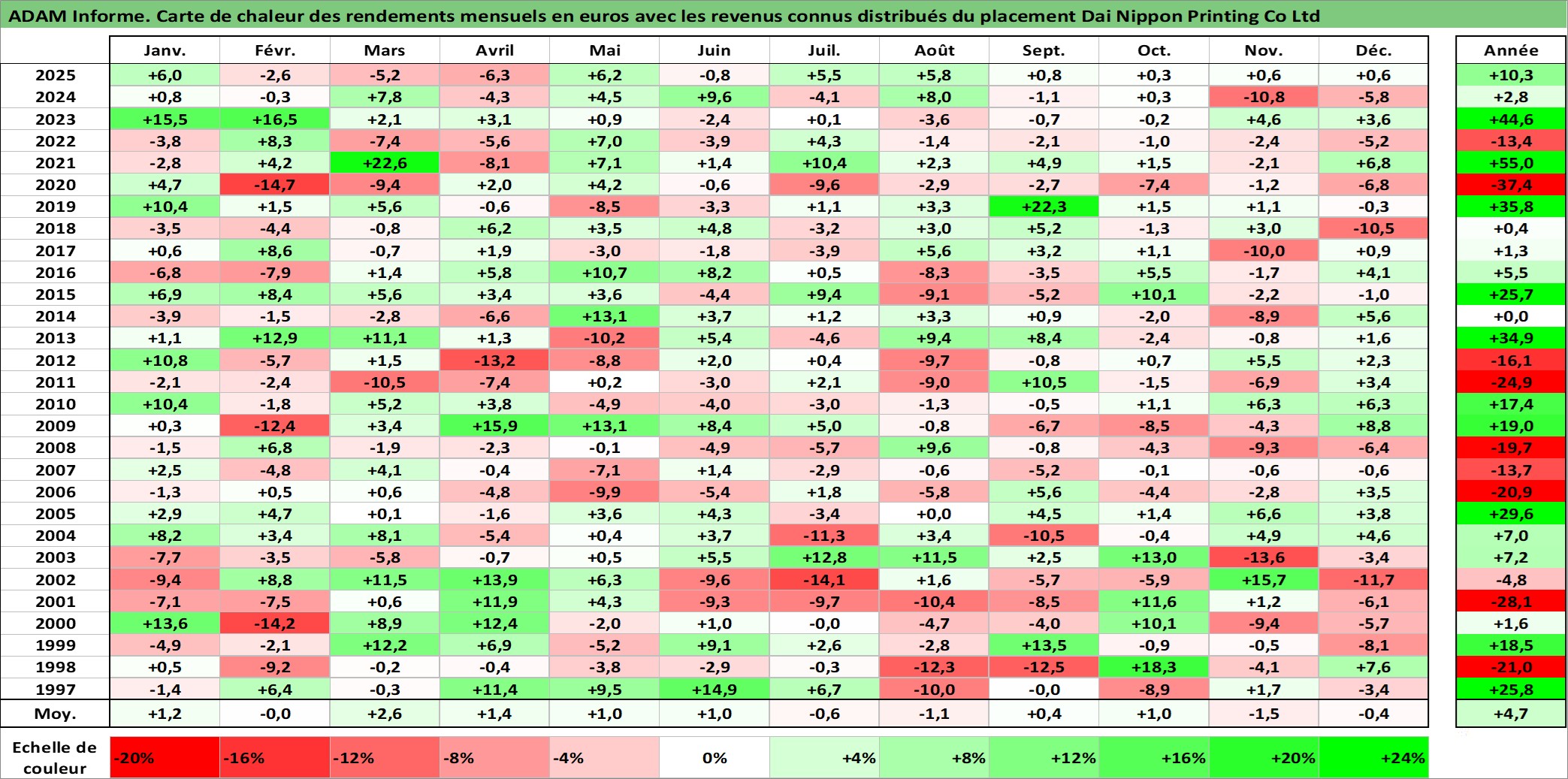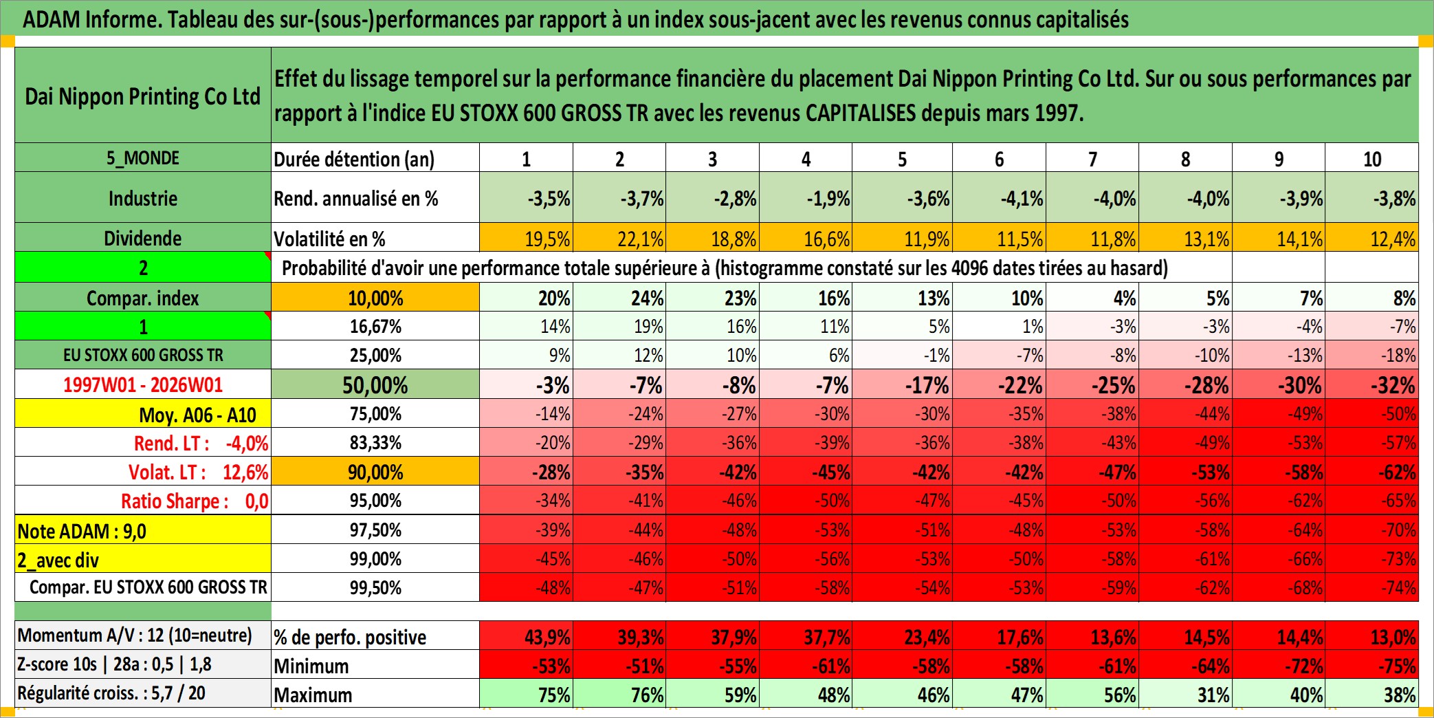 Site dédié aux investisseursPage dédiée sur site financeAnalyse des valorisations hebdomadaires de l'action Dai Nippon Printing Co Ltd. Cet actif est cote en JPY. Les valorisations sont en contrevaleur EURO et couvrent les semaines 1997W01 a 2026W01. Les revenus de cet actif financier sont pris en compte depuis la semaine 1997W13. La note globale ESG de cet actif est estimee a 19.0 (apres rebasage entre 0 et 20).