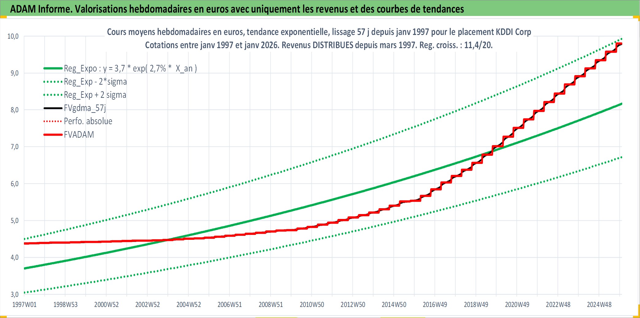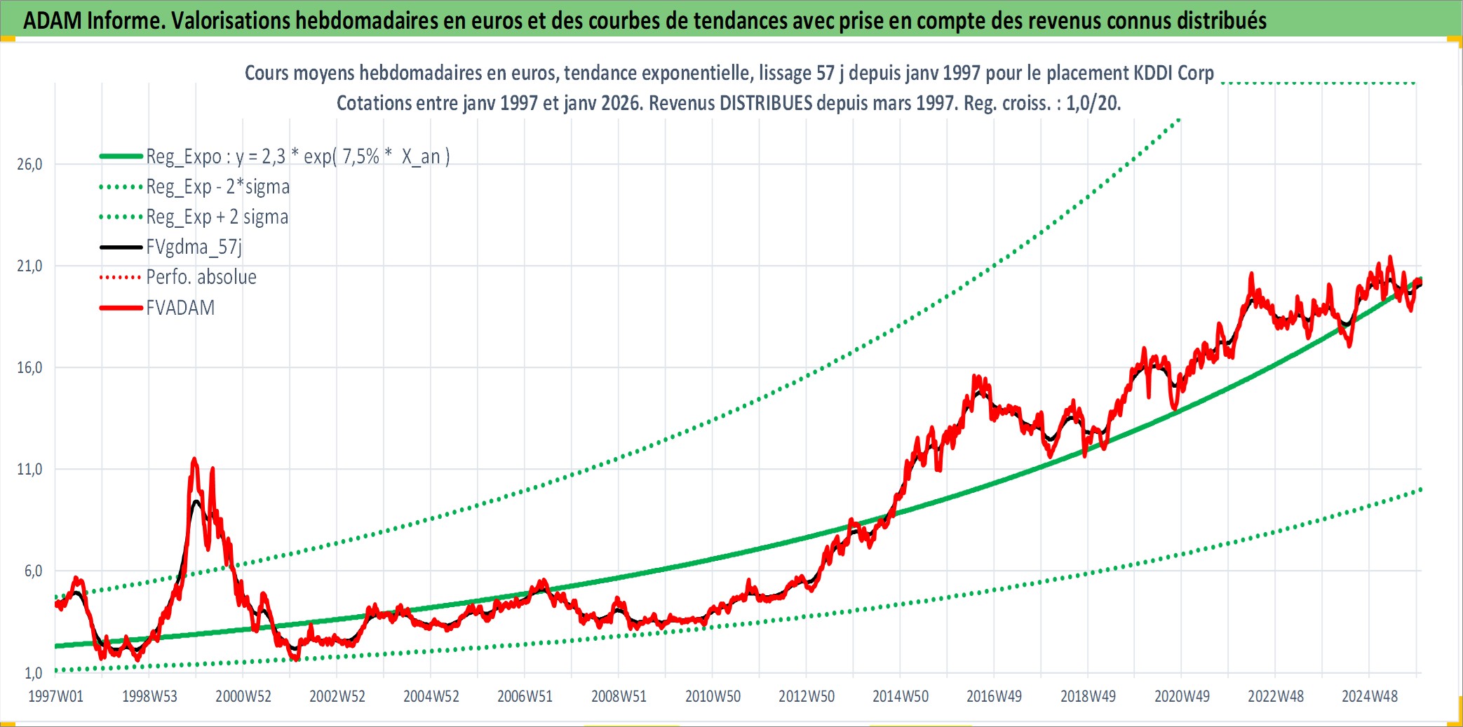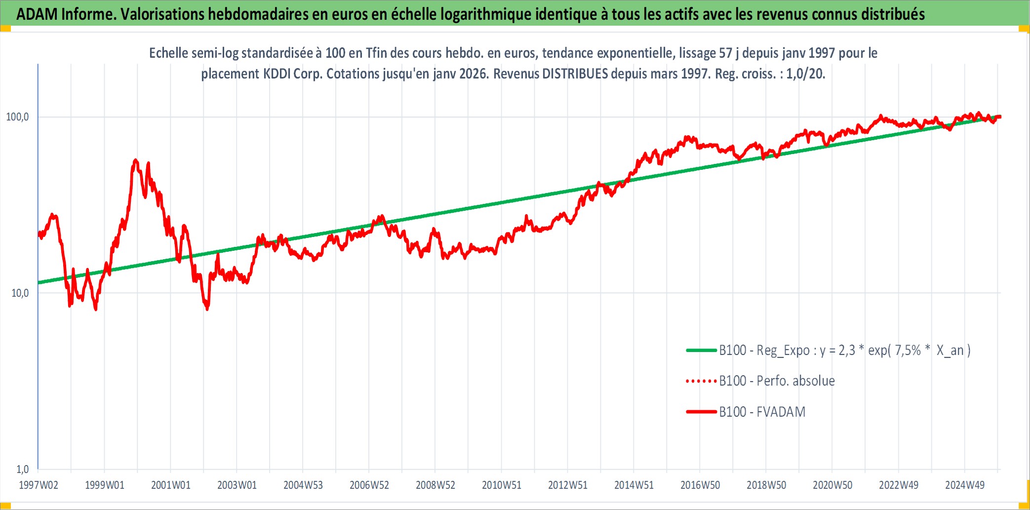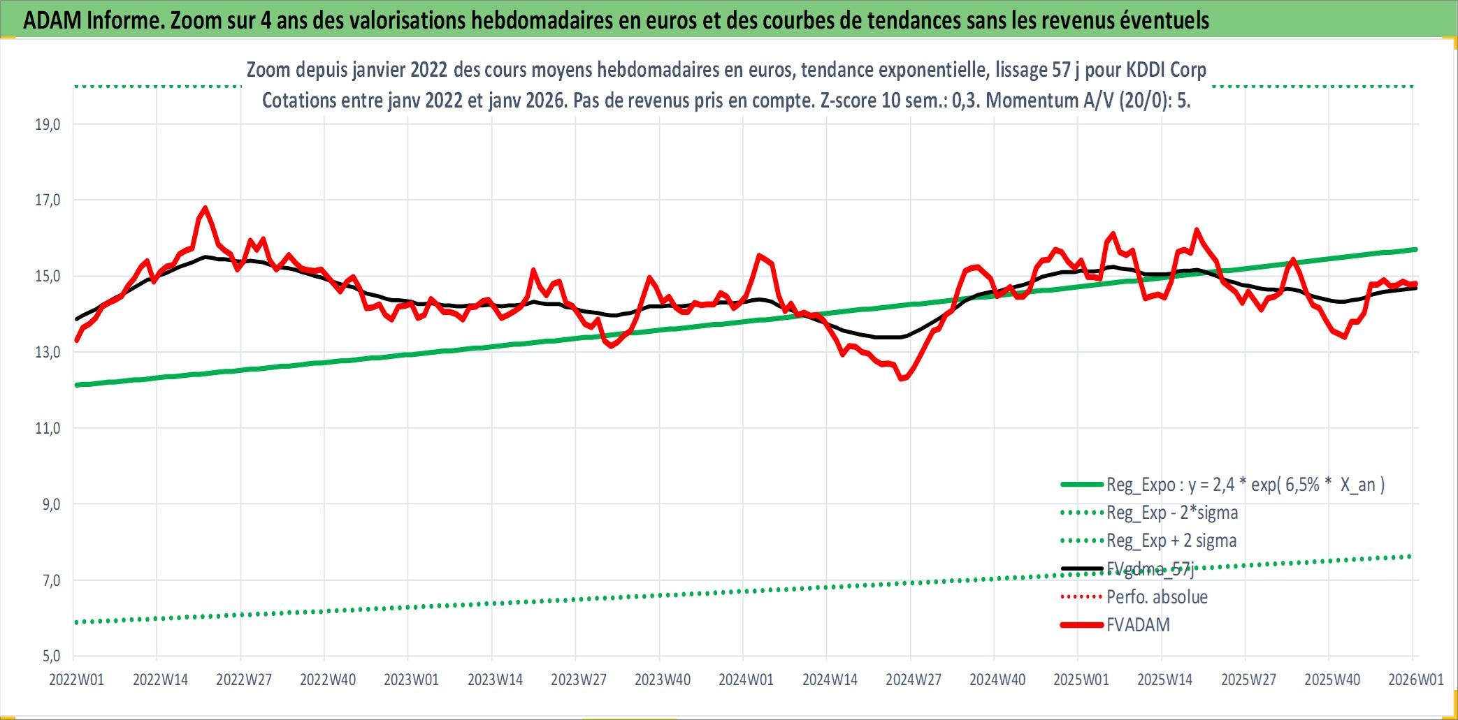 Site dédié aux investisseursPage dédiée sur site financeAnalyse des valorisations hebdomadaires de l'action KDDI Corp. Cet actif est cote en JPY. Les valorisations sont en contrevaleur EURO et couvrent les semaines 1997W01 a 2026W01. Les revenus de cet actif financier sont pris en compte depuis la semaine 1997W13. La note globale ESG de cet actif est estimee a 10.0 (apres rebasage entre 0 et 20).