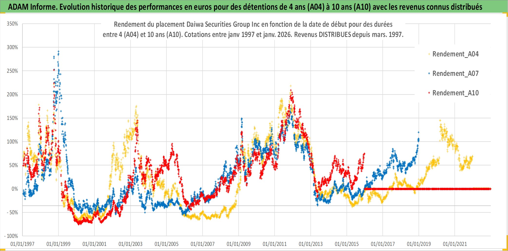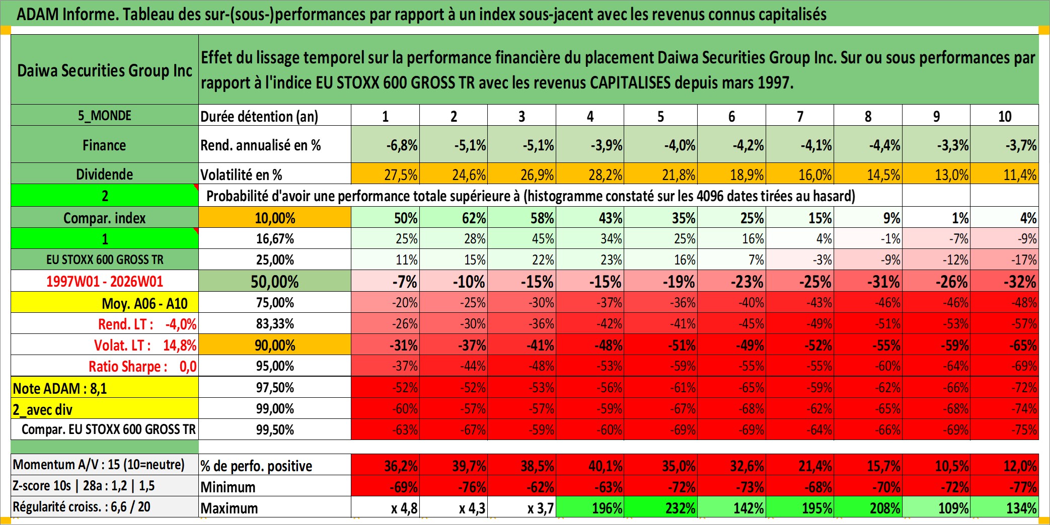 Site dédié aux investisseursPage dédiée sur site financeAnalyse des valorisations hebdomadaires de l'action Daiwa Securities Group Inc. Cet actif est cote en JPY. Les valorisations sont en contrevaleur EURO et couvrent les semaines 1997W01 a 2026W01. Les revenus de cet actif financier sont pris en compte depuis la semaine 1997W13. La note globale ESG de cet actif est estimee a 11.0 (apres rebasage entre 0 et 20).