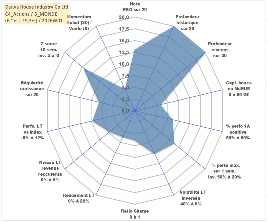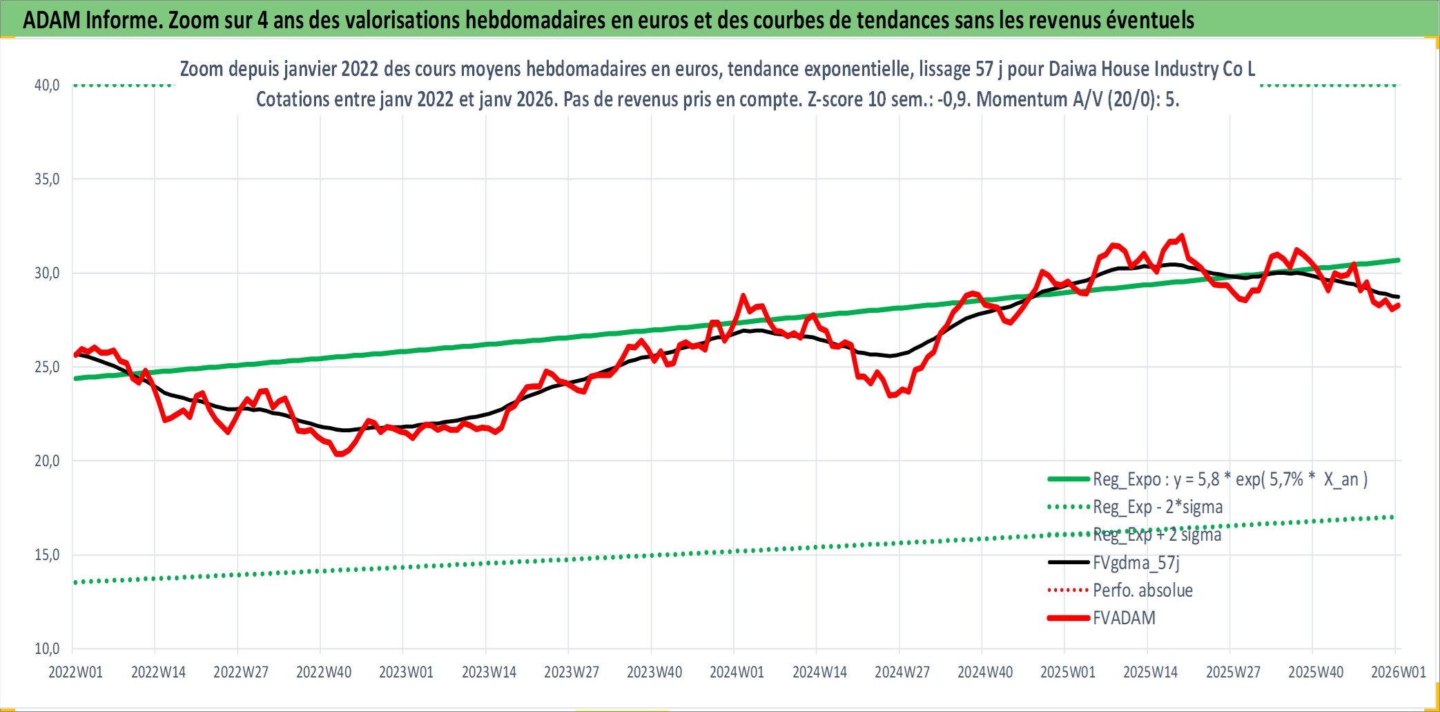 Site dédié aux investisseursPage dédiée sur site financeAnalyse des valorisations hebdomadaires de l'action Daiwa House Industry Co Ltd. Cet actif est cote en JPY. Les valorisations sont en contrevaleur EURO et couvrent les semaines 1997W01 a 2026W01. Les revenus de cet actif financier sont pris en compte depuis la semaine 1997W13. La note globale ESG de cet actif est estimee a 13.0 (apres rebasage entre 0 et 20).