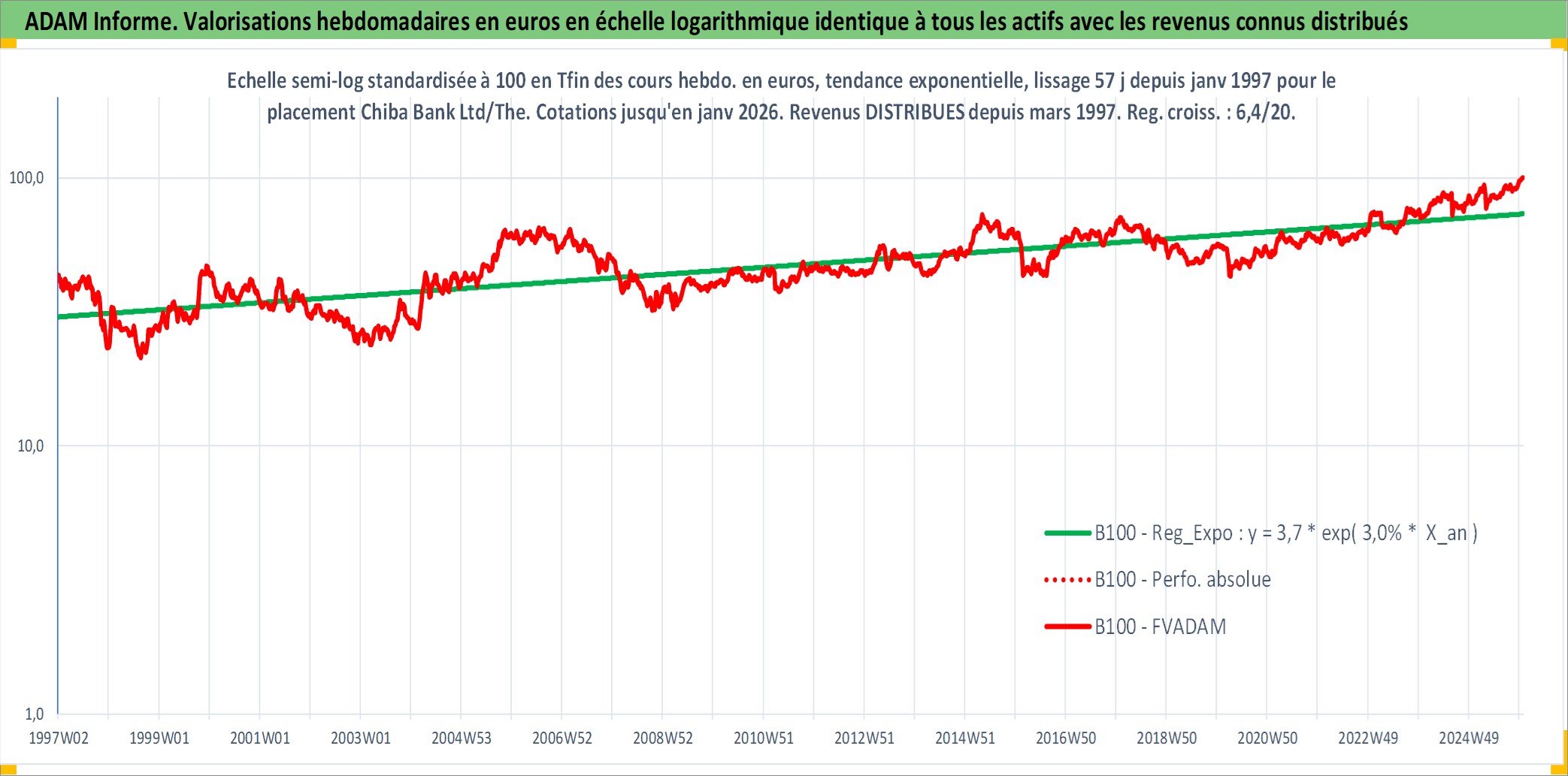 Site dédié aux investisseursPage dédiée sur site financeAnalyse des valorisations hebdomadaires de l'action Chiba Bank Ltd/The. Cet actif est cote en JPY. Les valorisations sont en contrevaleur EURO et couvrent les semaines 1997W01 a 2026W01. Les revenus de cet actif financier sont pris en compte depuis la semaine 1997W13. La note globale ESG de cet actif est estimee a 8.0 (apres rebasage entre 0 et 20).