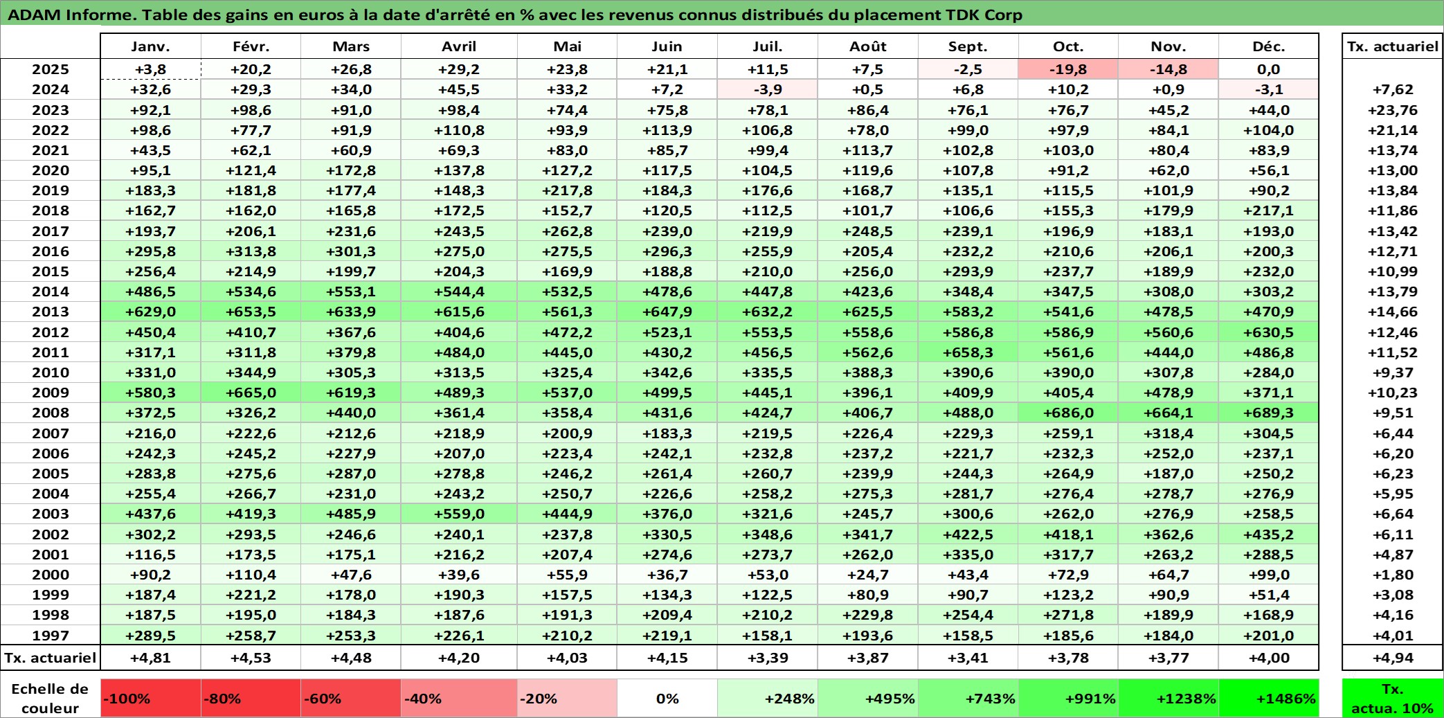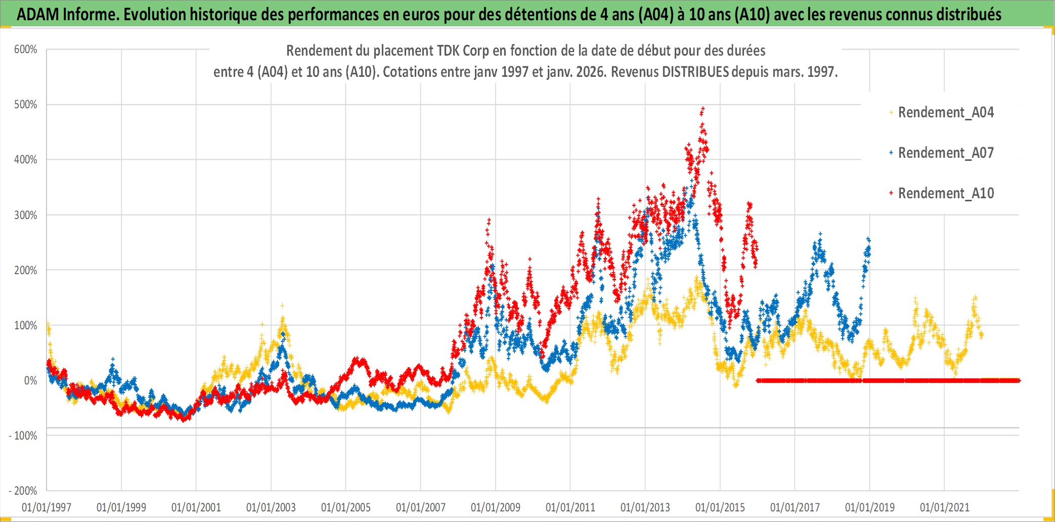Site dédié aux investisseursPage dédiée sur site financeAnalyse des valorisations hebdomadaires de l'action TDK Corp. Cet actif est cote en JPY. Les valorisations sont en contrevaleur EURO et couvrent les semaines 1997W01 a 2026W01. Les revenus de cet actif financier sont pris en compte depuis la semaine 1997W13. La note globale ESG de cet actif est estimee a 11.0 (apres rebasage entre 0 et 20).