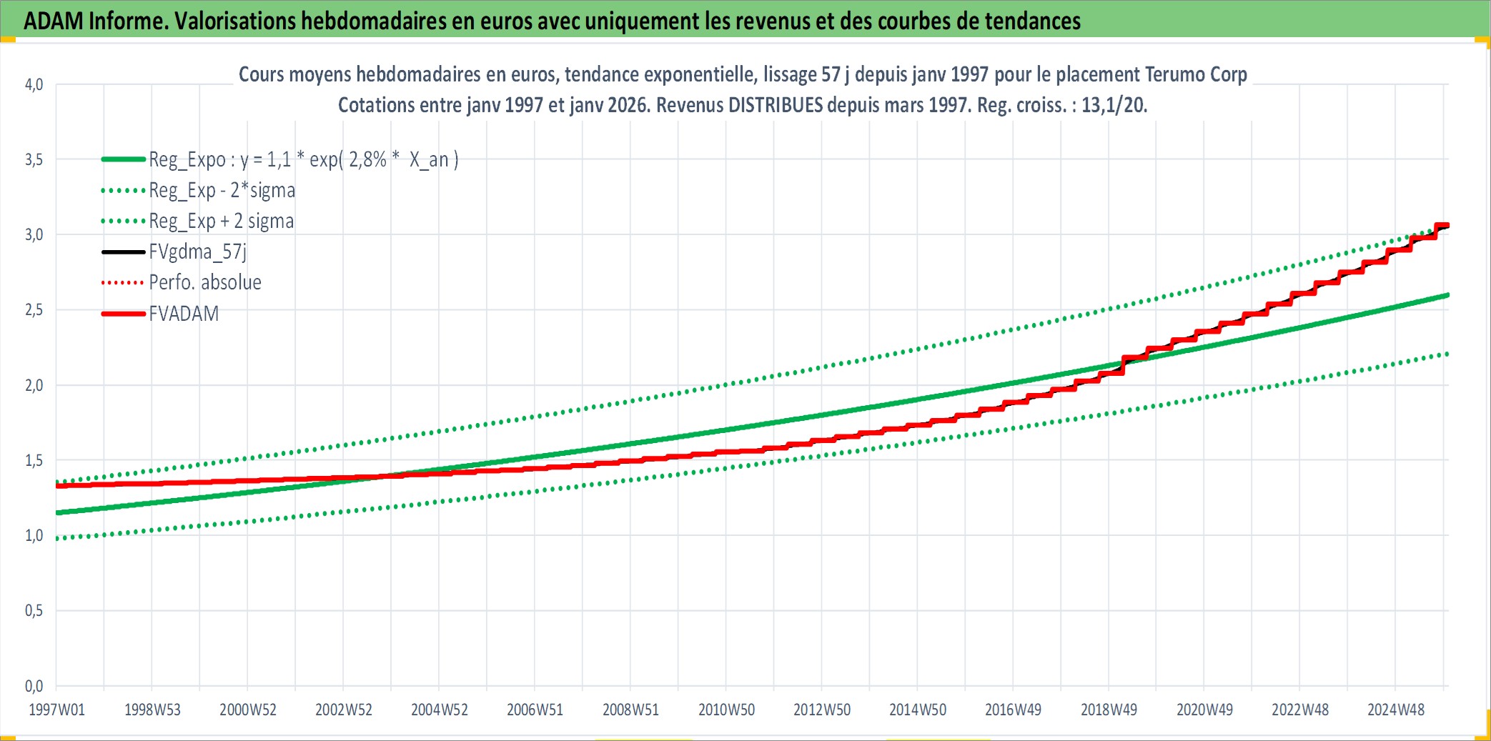 Site dédié aux investisseursPage dédiée sur site financeAnalyse des valorisations hebdomadaires de l'action Terumo Corp. Cet actif est cote en JPY. Les valorisations sont en contrevaleur EURO et couvrent les semaines 1997W01 a 2026W01. Les revenus de cet actif financier sont pris en compte depuis la semaine 1997W13. La note globale ESG de cet actif est estimee a 7.0 (apres rebasage entre 0 et 20).