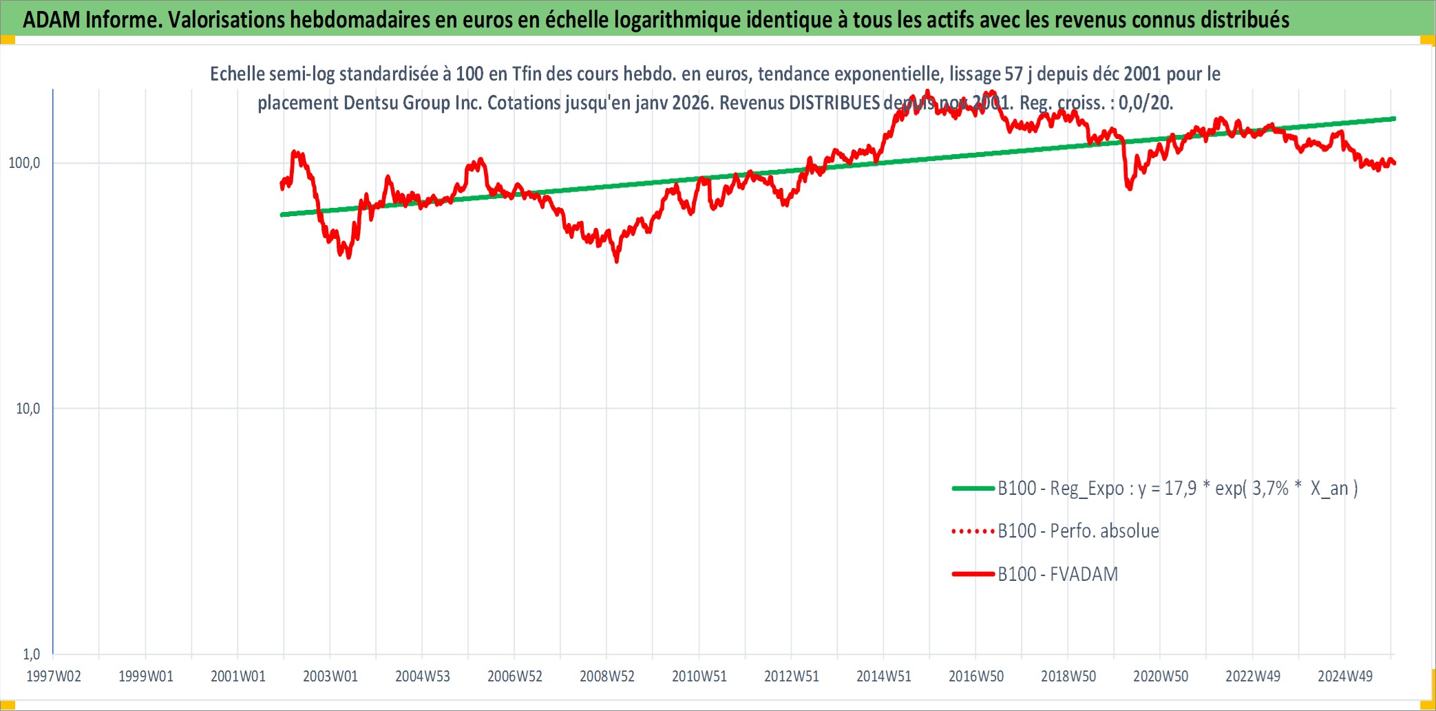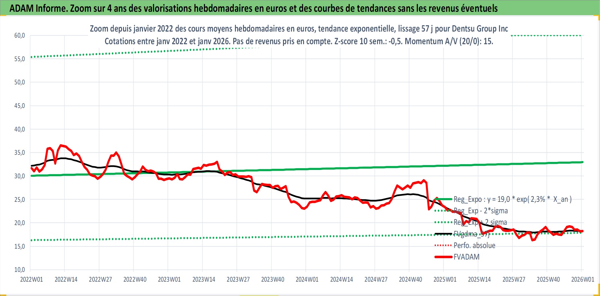 Site dédié aux investisseursPage dédiée sur site financeAnalyse des valorisations hebdomadaires de l'action Dentsu Group Inc. Cet actif est cote en JPY. Les valorisations sont en contrevaleur EURO et couvrent les semaines 2001W50 a 2026W01. Les revenus de cet actif financier sont pris en compte depuis la semaine 2001W48. La note globale ESG de cet actif est estimee a 9.0 (apres rebasage entre 0 et 20).