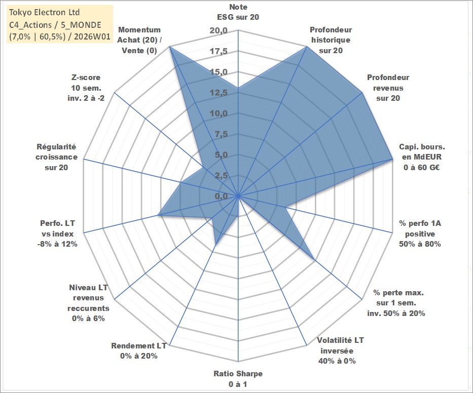 Site dédié aux investisseursPage dédiée sur site financeAnalyse des valorisations hebdomadaires de l'action Tokyo Electron Ltd. Cet actif est cote en JPY. Les valorisations sont en contrevaleur EURO et couvrent les semaines 1997W01 a 2026W01. Les revenus de cet actif financier sont pris en compte depuis la semaine 1997W13. La note globale ESG de cet actif est estimee a 13.0 (apres rebasage entre 0 et 20).