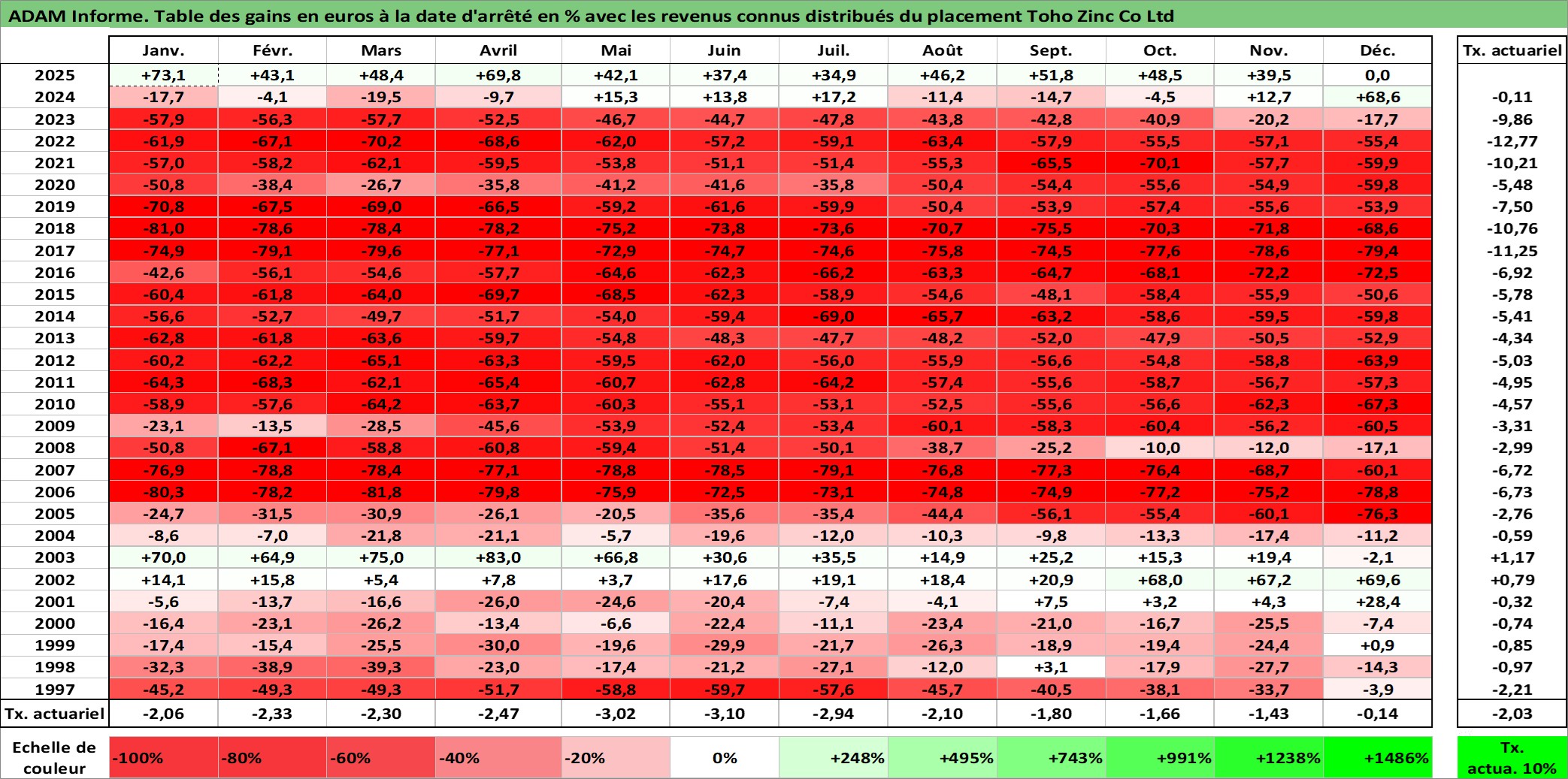 Site dédié aux investisseursPage dédiée sur site financeAnalyse des valorisations hebdomadaires de l'action Toho Zinc Co Ltd. Cet actif est cote en JPY. Les valorisations sont en contrevaleur EURO et couvrent les semaines 1997W01 a 2026W01. Les revenus de cet actif financier sont pris en compte depuis la semaine 1997W13. La note ESG de cet actif n'est pas connue.