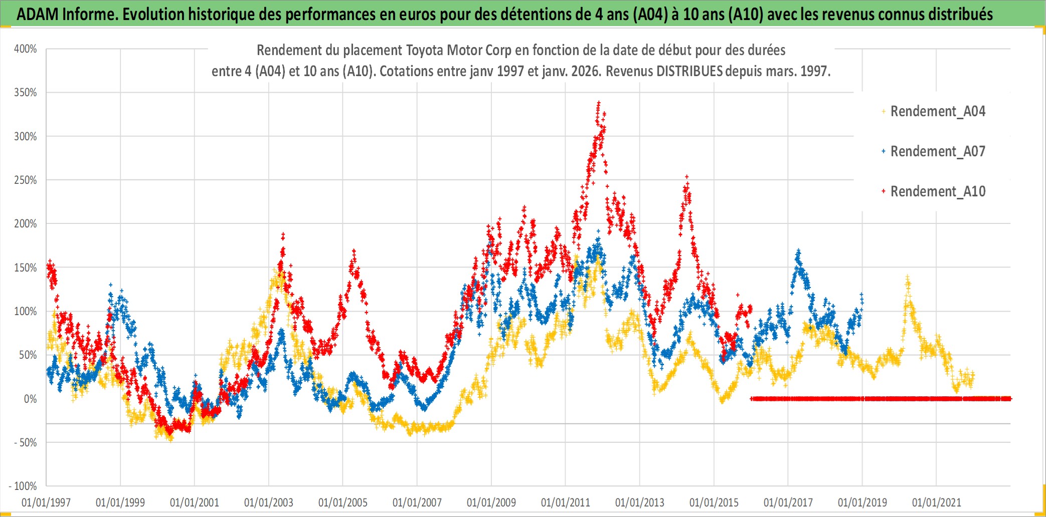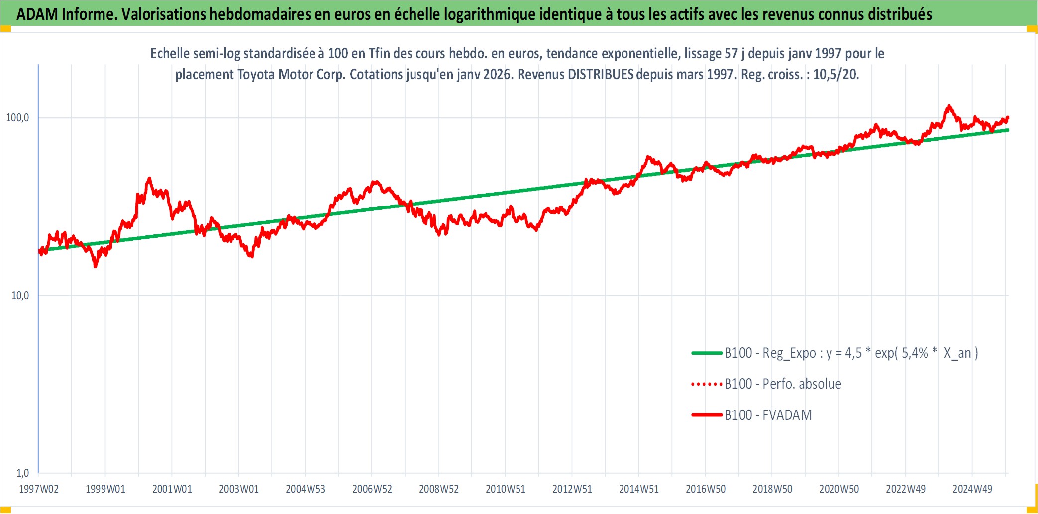 Site dédié aux investisseursPage dédiée sur site financeAnalyse des valorisations hebdomadaires de l'action Toyota Motor Corp. Cet actif est cote en JPY. Les valorisations sont en contrevaleur EURO et couvrent les semaines 1997W01 a 2026W01. Les revenus de cet actif financier sont pris en compte depuis la semaine 1997W13. La note globale ESG de cet actif est estimee a 6.0 (apres rebasage entre 0 et 20).