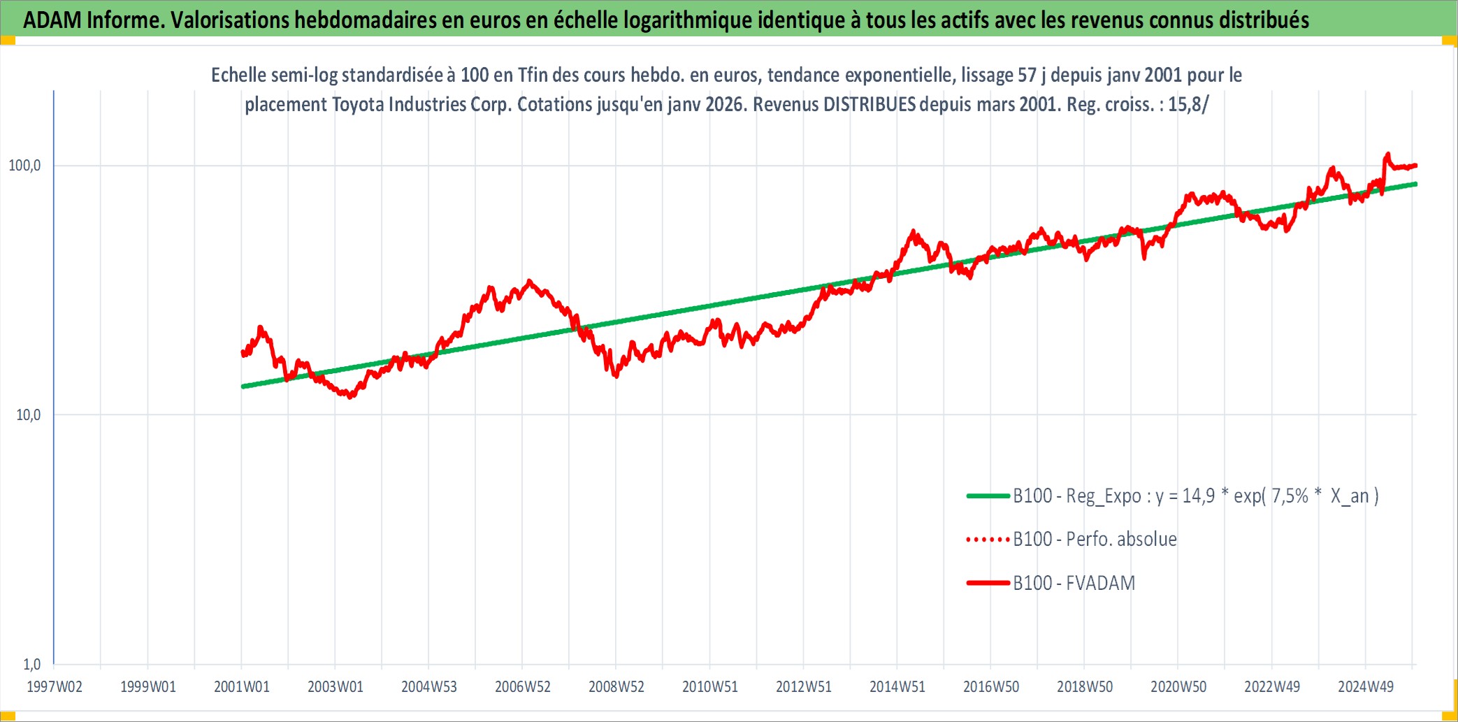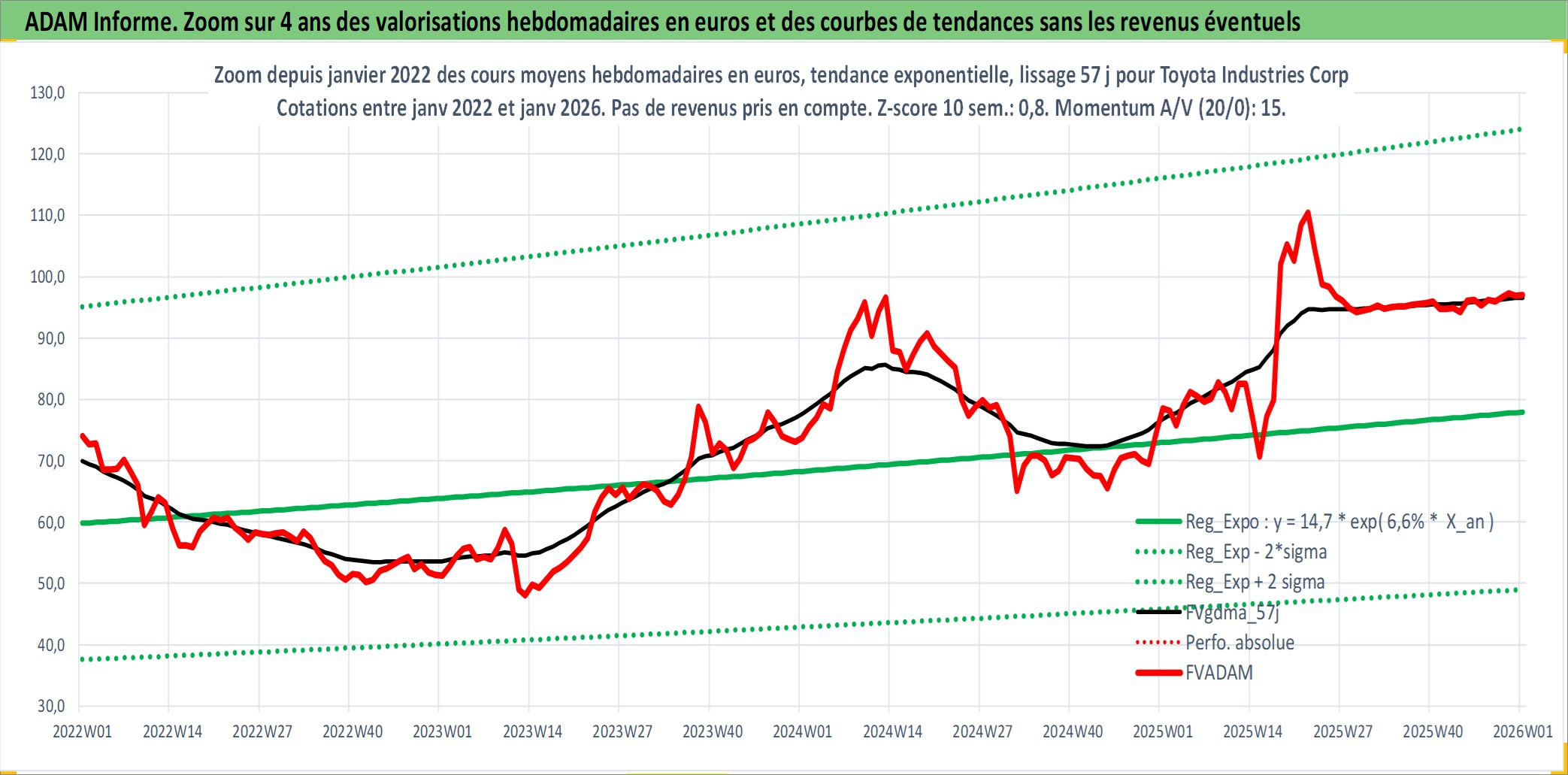 Site dédié aux investisseursPage dédiée sur site financeAnalyse des valorisations hebdomadaires de l'action Toyota Industries Corp. Cet actif est cote en JPY. Les valorisations sont en contrevaleur EURO et couvrent les semaines 2001W02 a 2026W01. Les revenus de cet actif financier sont pris en compte depuis la semaine 2001W13. La note globale ESG de cet actif est estimee a 5.0 (apres rebasage entre 0 et 20).