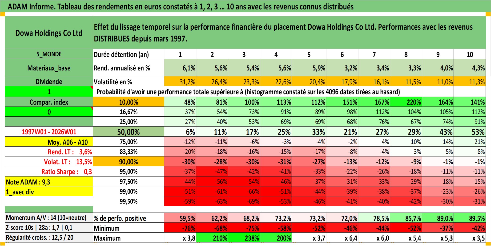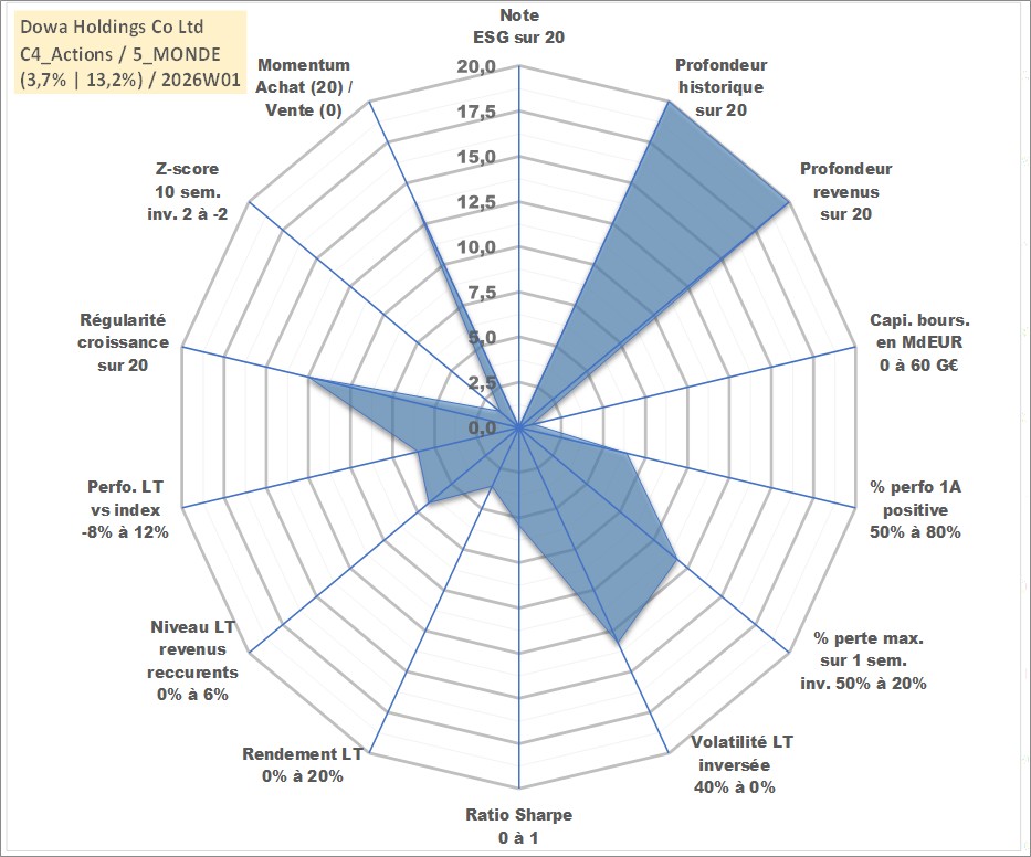 Site dédié aux investisseursPage dédiée sur site financeAnalyse des valorisations hebdomadaires de l'action Dowa Holdings Co Ltd. Cet actif est cote en JPY. Les valorisations sont en contrevaleur EURO et couvrent les semaines 1997W01 a 2026W01. Les revenus de cet actif financier sont pris en compte depuis la semaine 1997W13. La note ESG de cet actif n'est pas connue.