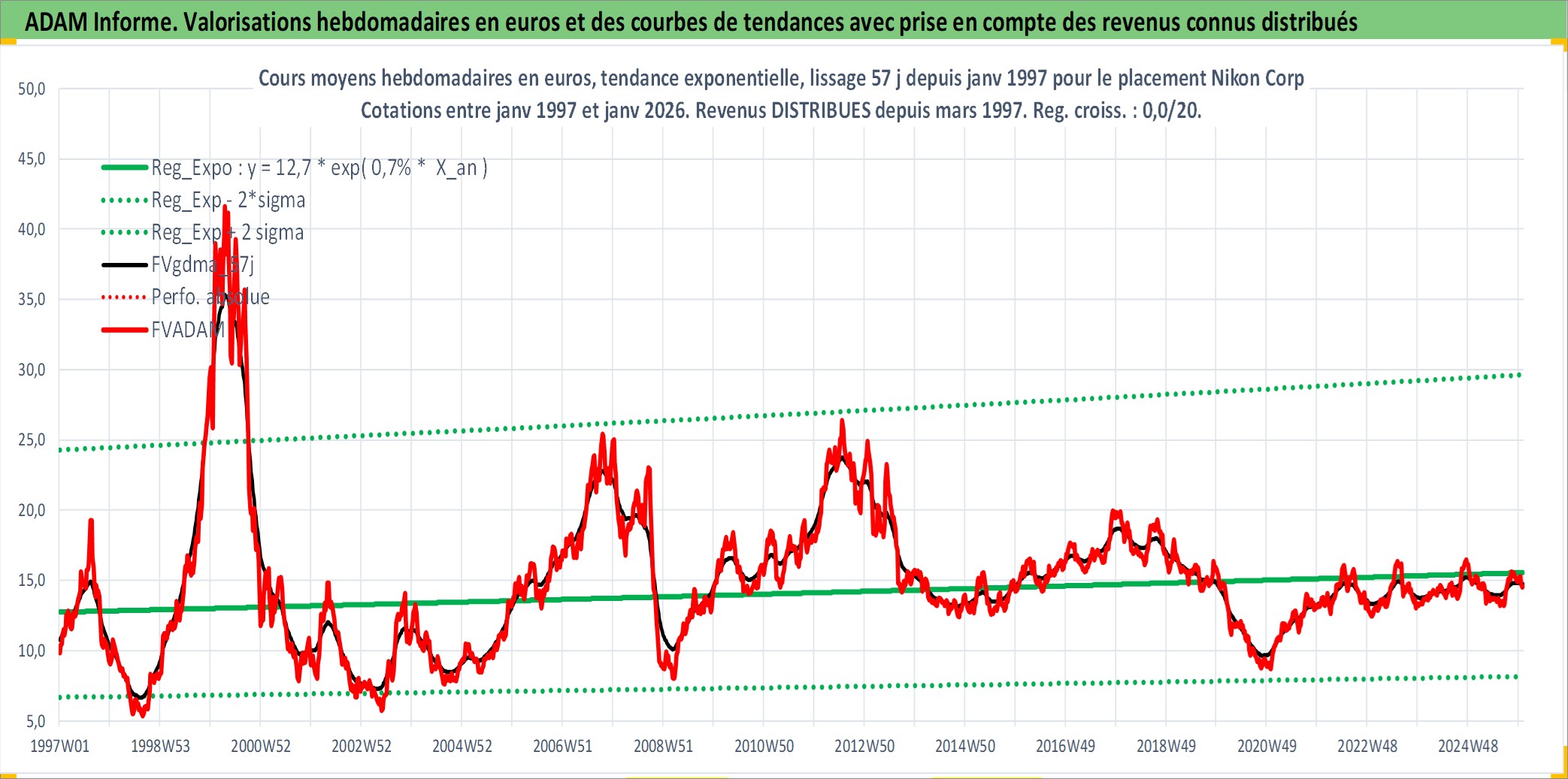 Site dédié aux investisseursPage dédiée sur site financeAnalyse des valorisations hebdomadaires de l'action Nikon Corp. Cet actif est cote en JPY. Les valorisations sont en contrevaleur EURO et couvrent les semaines 1997W01 a 2026W01. Les revenus de cet actif financier sont pris en compte depuis la semaine 1997W13. La note globale ESG de cet actif est estimee a 13.0 (apres rebasage entre 0 et 20).