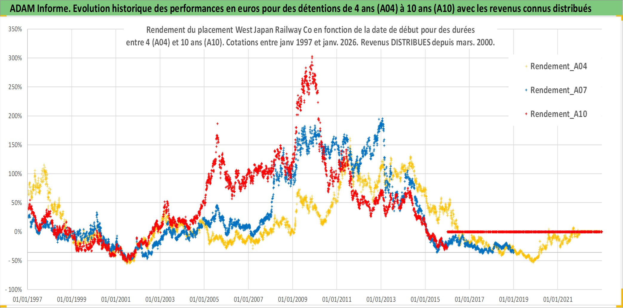 Site dédié aux investisseursPage dédiée sur site financeAnalyse des valorisations hebdomadaires de l'action West Japan Railway Co. Cet actif est cote en JPY. Les valorisations sont en contrevaleur EURO et couvrent les semaines 1997W01 a 2026W01. Les revenus de cet actif financier sont pris en compte depuis la semaine 2000W13. La note globale ESG de cet actif est estimee a 7.0 (apres rebasage entre 0 et 20).