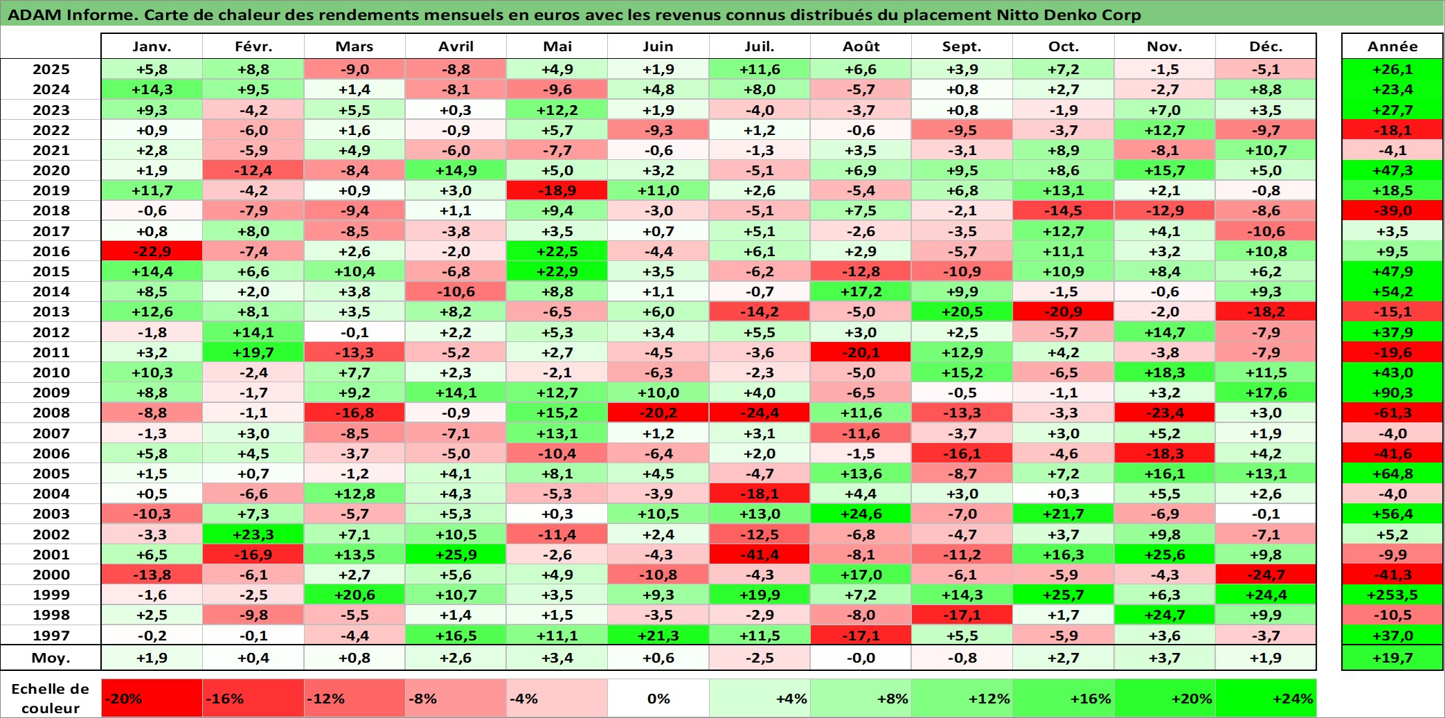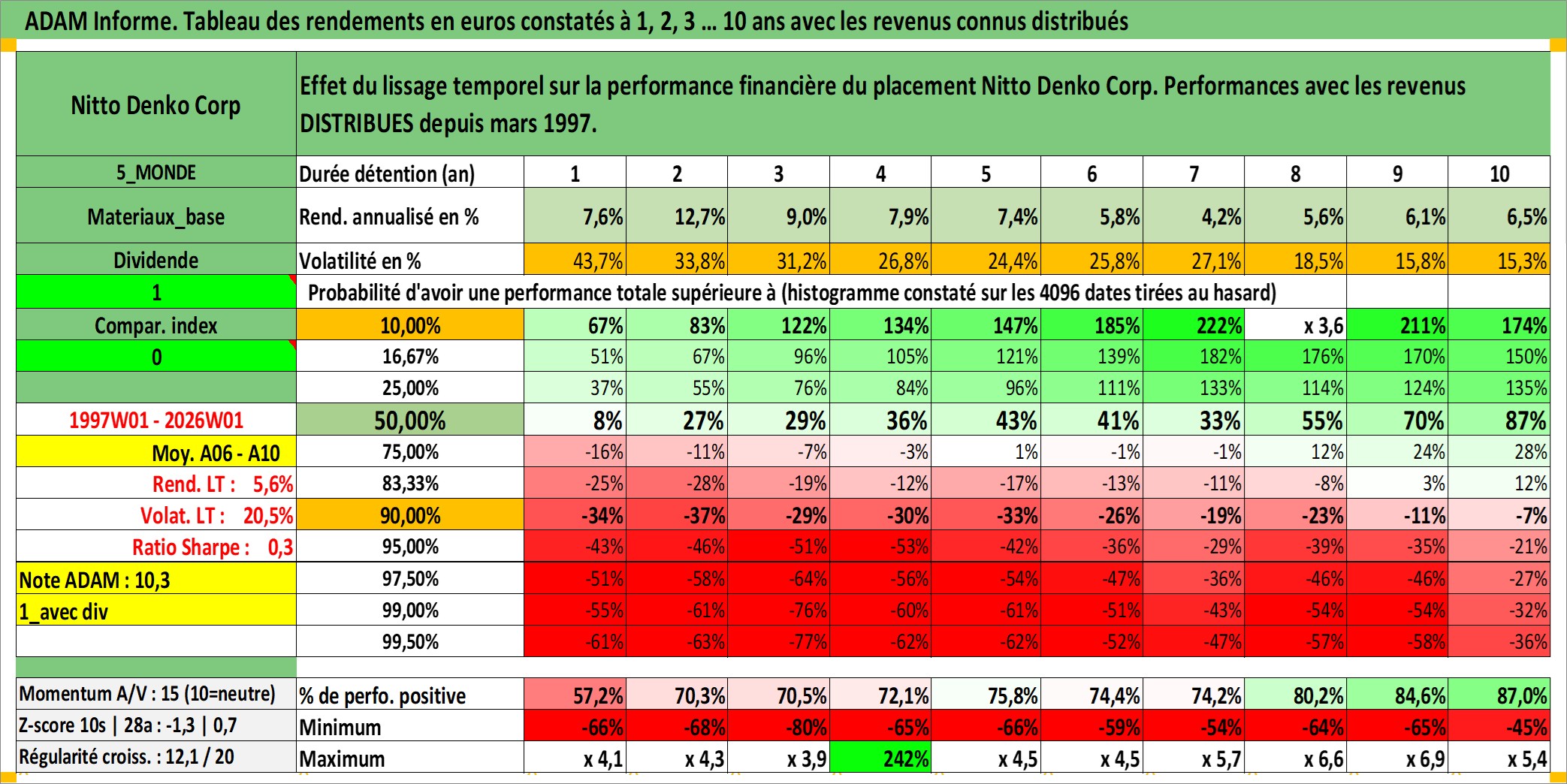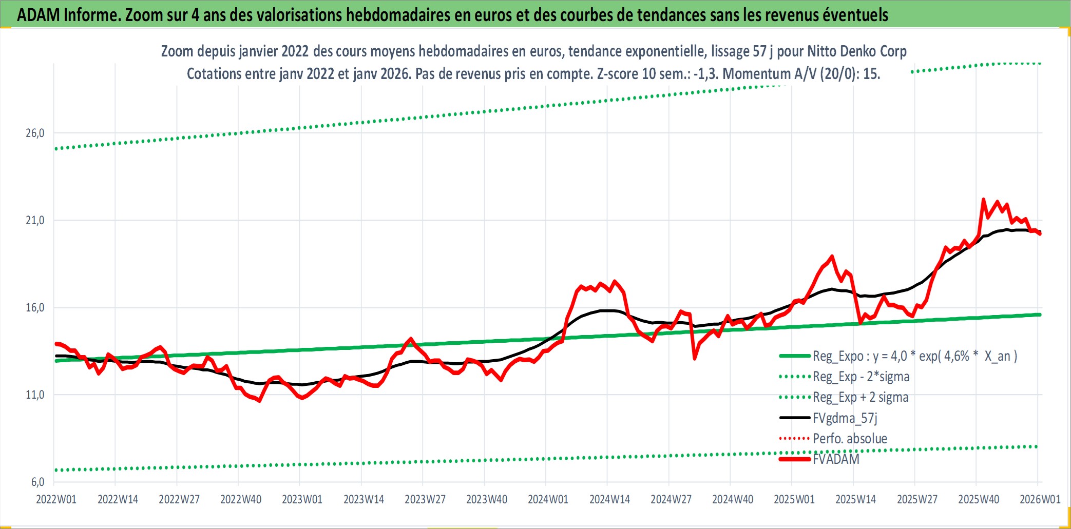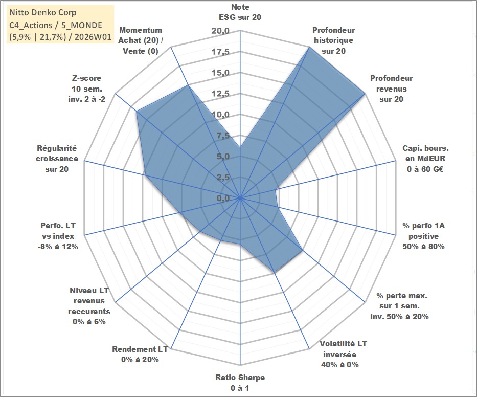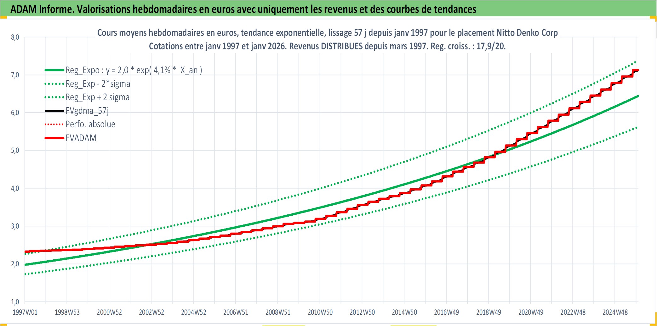 Site dédié aux investisseursPage dédiée sur site financeAnalyse des valorisations hebdomadaires de l'action Nitto Denko Corp. Cet actif est cote en JPY. Les valorisations sont en contrevaleur EURO et couvrent les semaines 1997W01 a 2026W01. Les revenus de cet actif financier sont pris en compte depuis la semaine 1997W13. La note globale ESG de cet actif est estimee a 6.0 (apres rebasage entre 0 et 20).