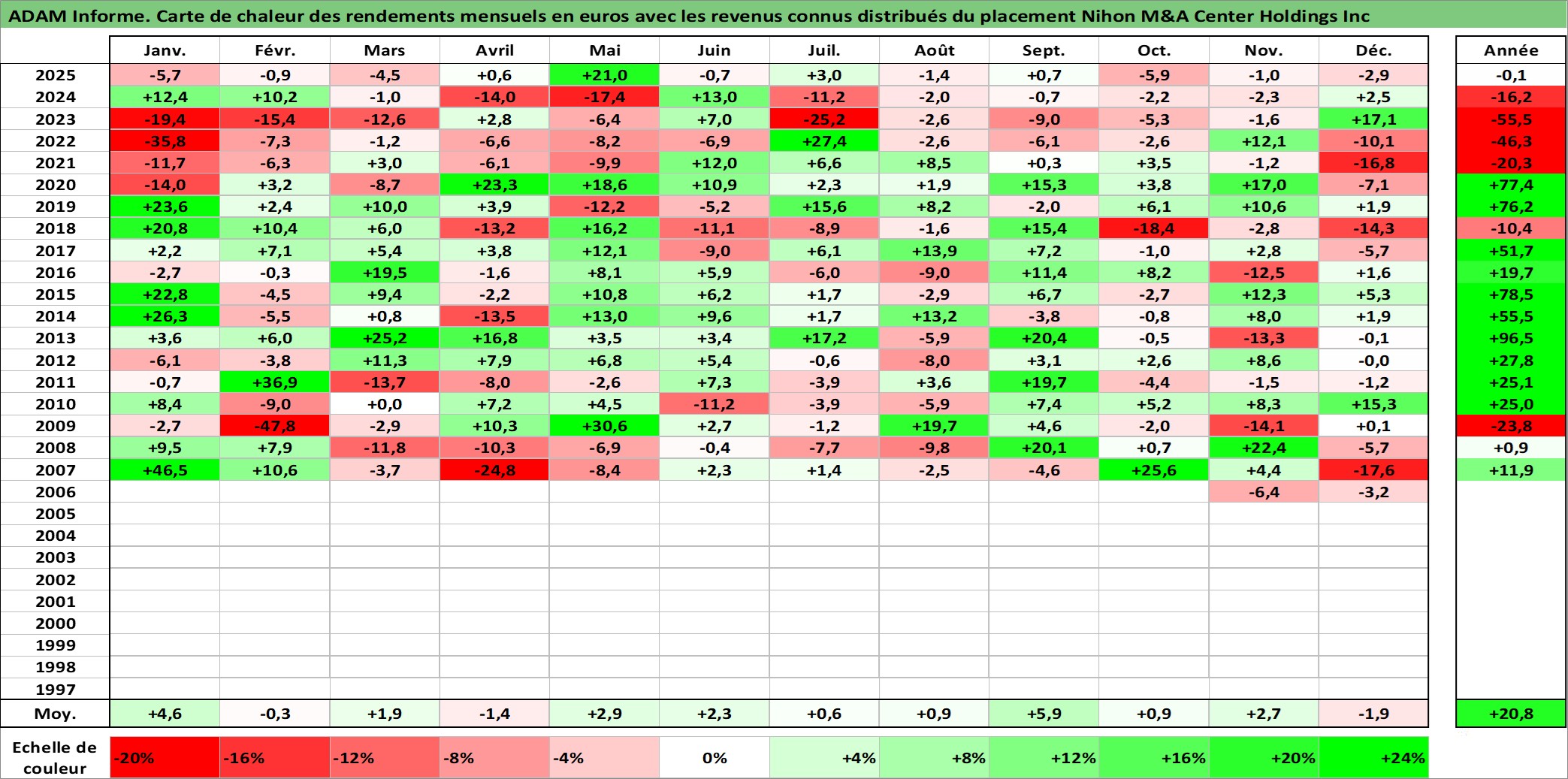Site dédié aux investisseursPage dédiée sur site financeAnalyse des valorisations hebdomadaires de l'action Nihon M&A Center Holdings Inc. Cet actif est cote en JPY. Les valorisations sont en contrevaleur EURO et couvrent les semaines 2006W42 a 2026W01. Les revenus de cet actif financier sont pris en compte depuis la semaine 2007W13. La note ESG de cet actif n'est pas connue.