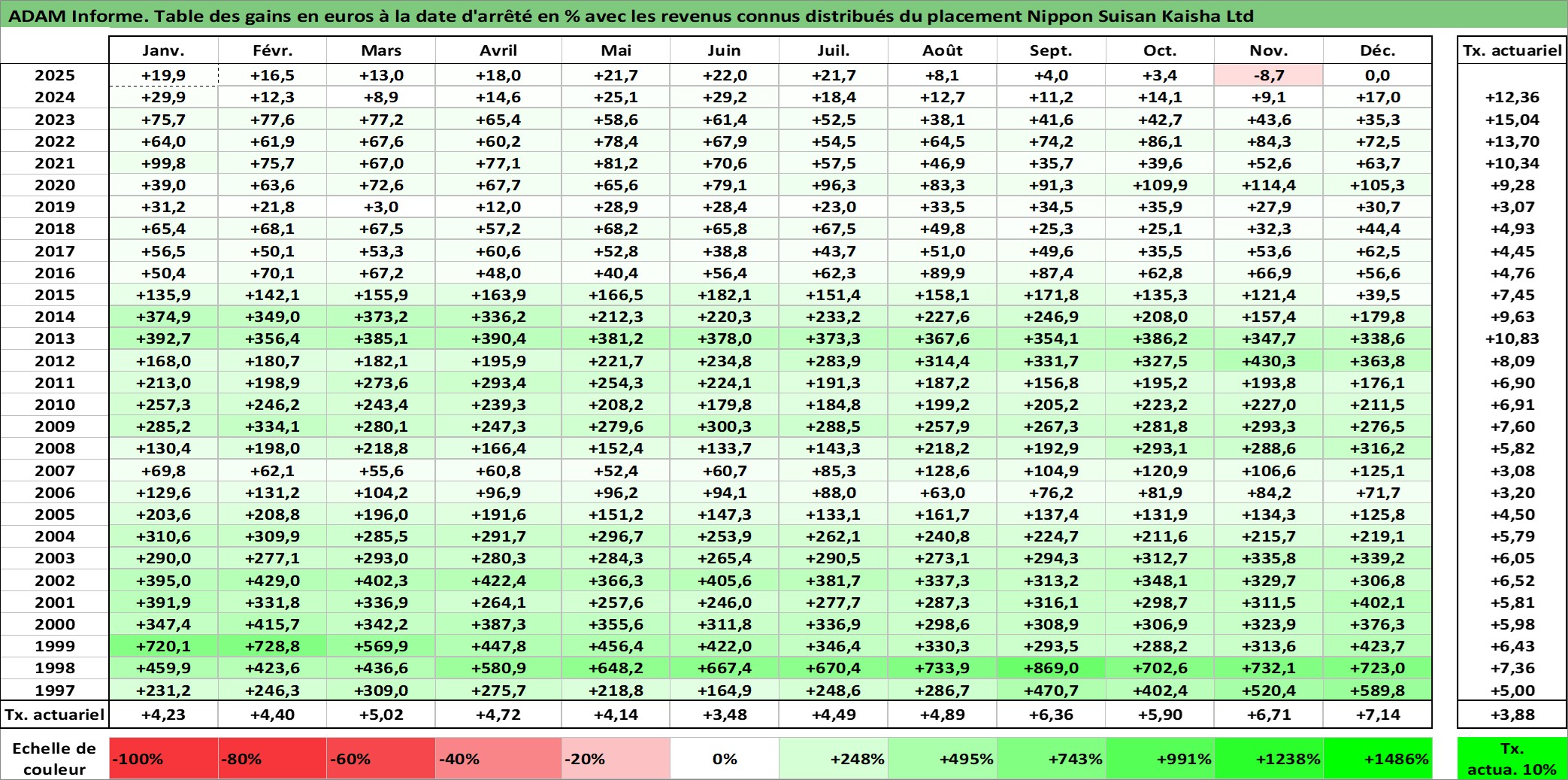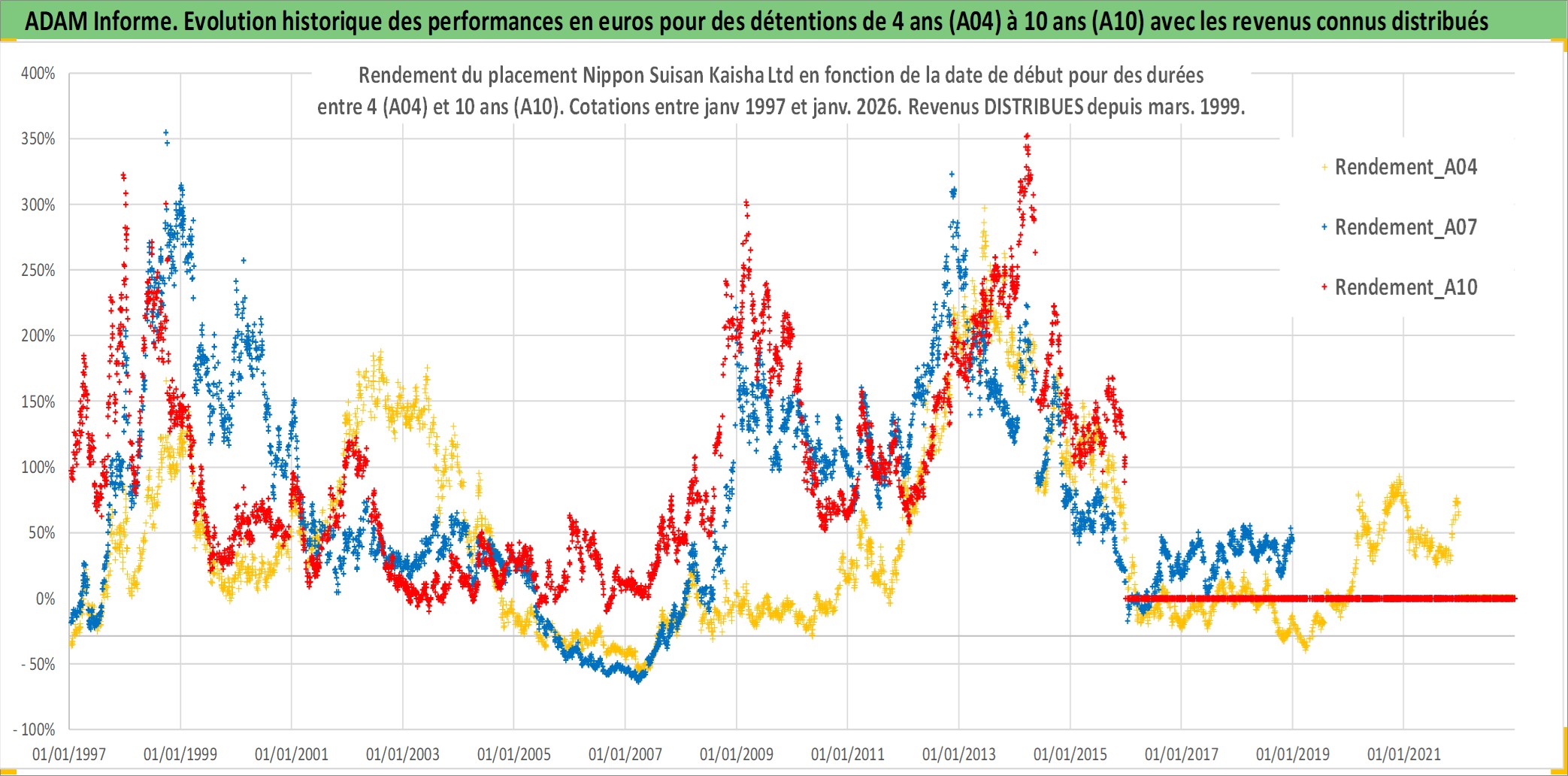 Site dédié aux investisseursPage dédiée sur site financeAnalyse des valorisations hebdomadaires de l'action Nippon Suisan Kaisha Ltd. Cet actif est cote en JPY. Les valorisations sont en contrevaleur EURO et couvrent les semaines 1997W01 a 2026W01. Les revenus de cet actif financier sont pris en compte depuis la semaine 1999W12. La note ESG de cet actif n'est pas connue.