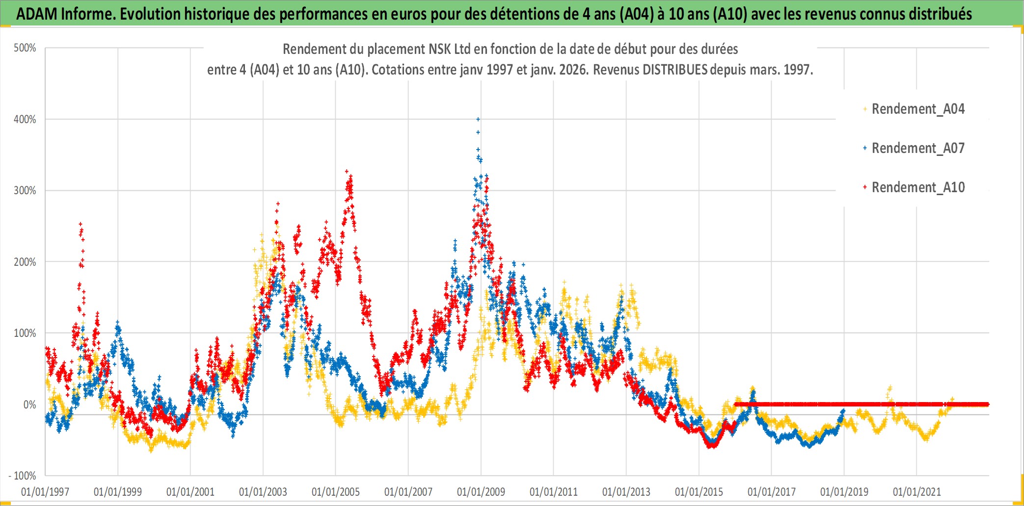 Site dédié aux investisseursPage dédiée sur site financeAnalyse des valorisations hebdomadaires de l'action NSK Ltd. Cet actif est cote en JPY. Les valorisations sont en contrevaleur EURO et couvrent les semaines 1997W01 a 2026W01. Les revenus de cet actif financier sont pris en compte depuis la semaine 1997W13. La note globale ESG de cet actif est estimee a 11.0 (apres rebasage entre 0 et 20).