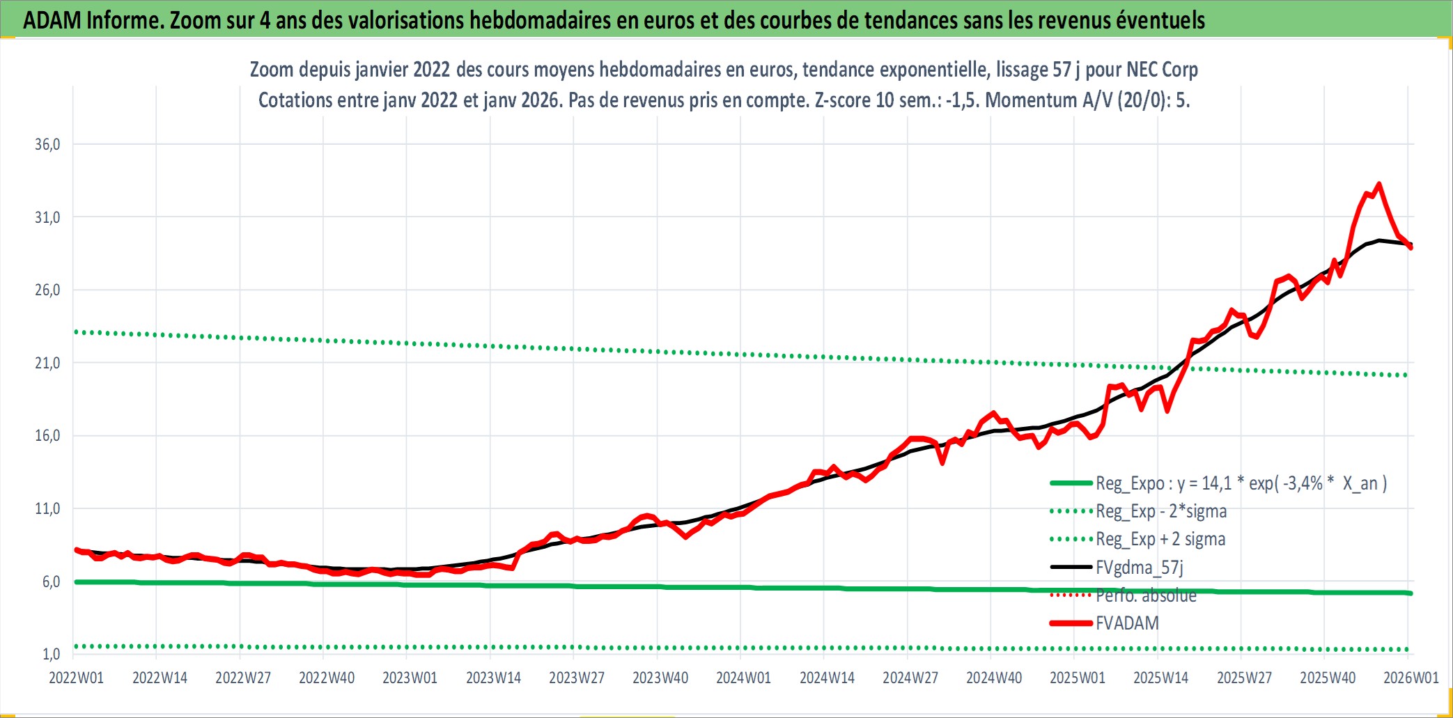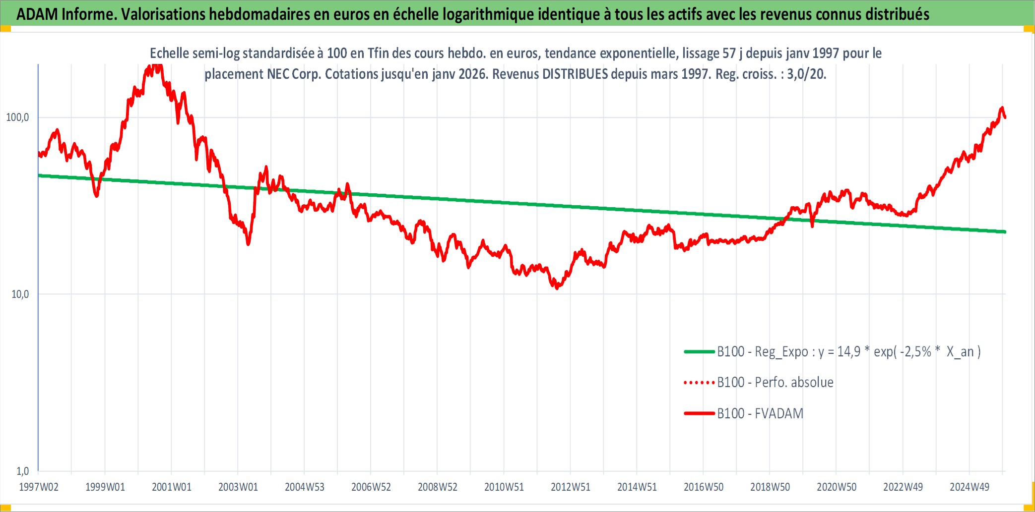 Site dédié aux investisseursPage dédiée sur site financeAnalyse des valorisations hebdomadaires de l'action NEC Corp. Cet actif est cote en JPY. Les valorisations sont en contrevaleur EURO et couvrent les semaines 1997W01 a 2026W01. Les revenus de cet actif financier sont pris en compte depuis la semaine 1997W13. La note globale ESG de cet actif est estimee a 13.0 (apres rebasage entre 0 et 20).