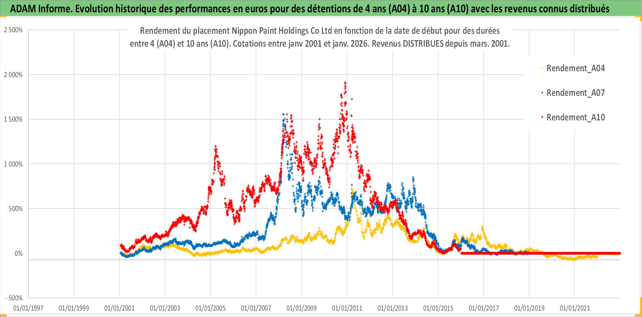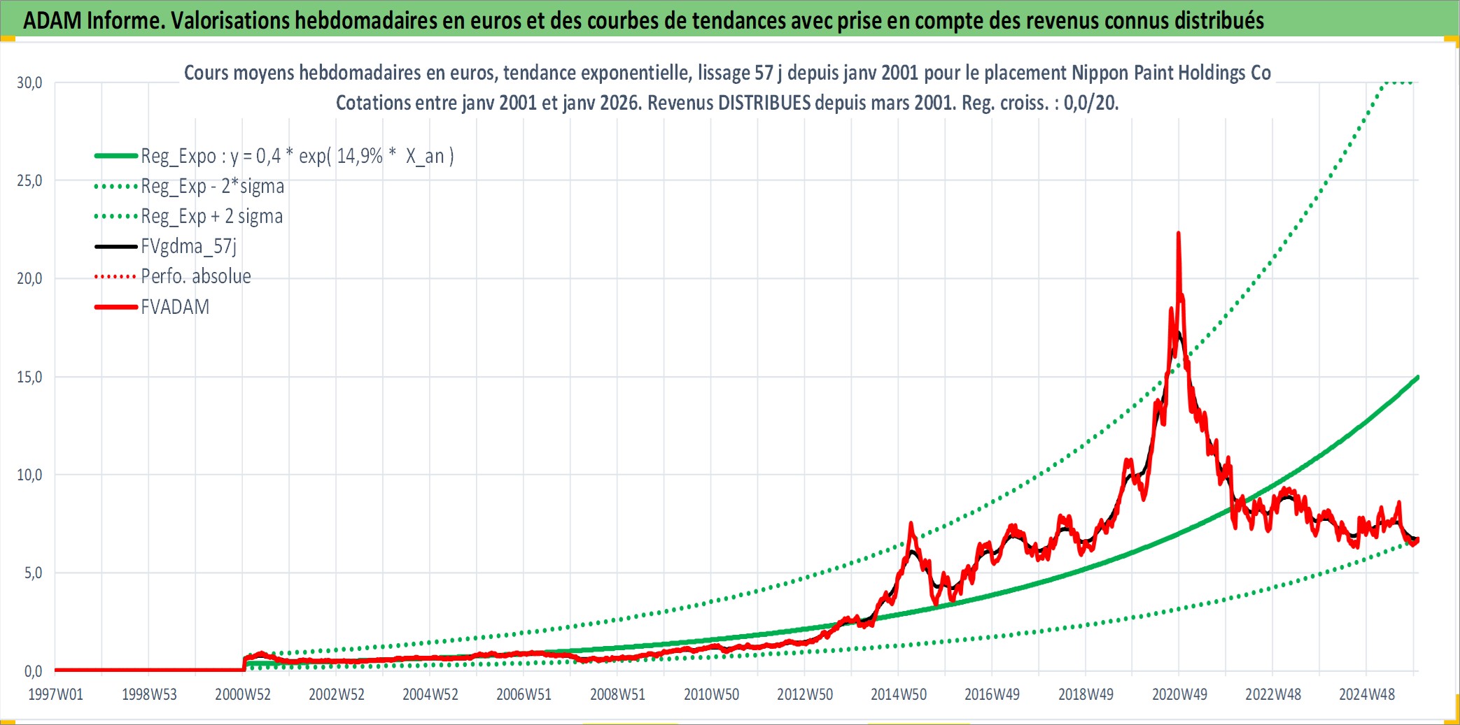 Site dédié aux investisseursPage dédiée sur site financeAnalyse des valorisations hebdomadaires de l'action Nippon Paint Holdings Co Ltd. Cet actif est cote en JPY. Les valorisations sont en contrevaleur EURO et couvrent les semaines 2001W02 a 2026W01. Les revenus de cet actif financier sont pris en compte depuis la semaine 2001W13. La note globale ESG de cet actif est estimee a 4.0 (apres rebasage entre 0 et 20).