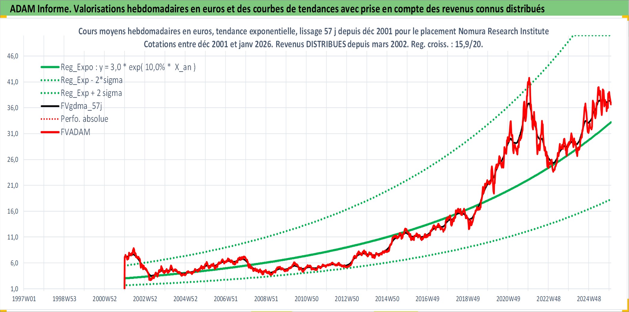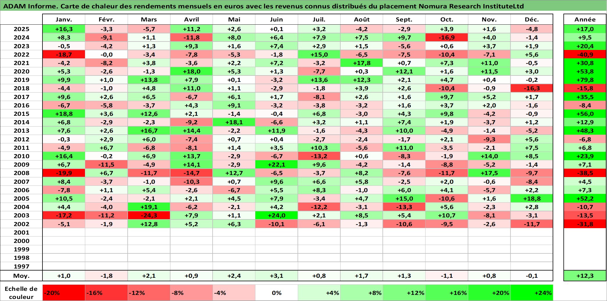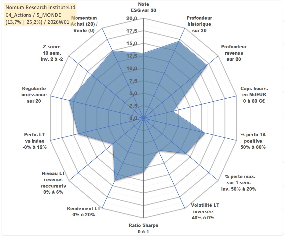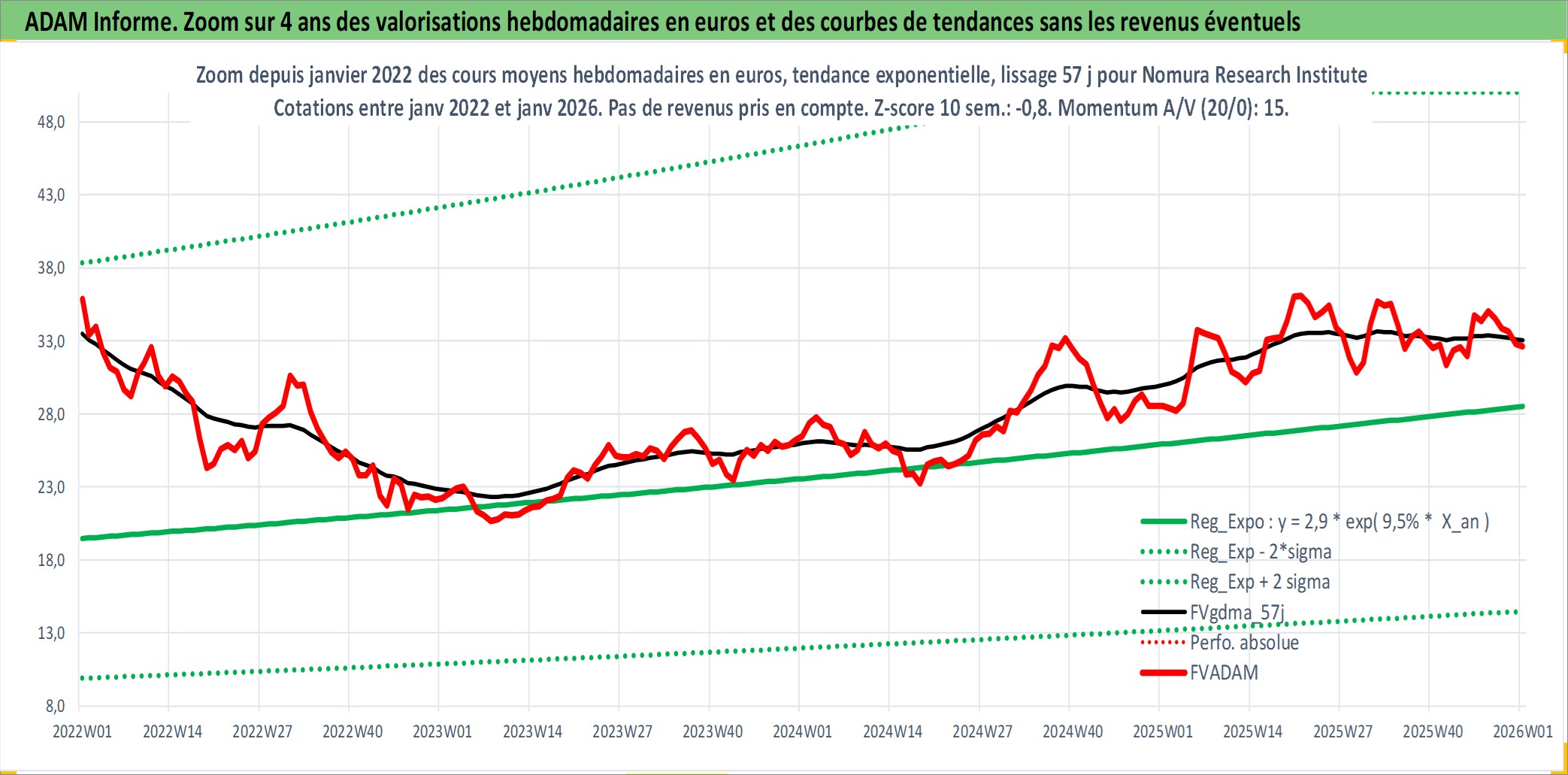 Site dédié aux investisseursPage dédiée sur site financeAnalyse des valorisations hebdomadaires de l'action Nomura Research InstituteLtd. Cet actif est cote en JPY. Les valorisations sont en contrevaleur EURO et couvrent les semaines 2001W52 a 2026W01. Les revenus de cet actif financier sont pris en compte depuis la semaine 2002W13. La note globale ESG de cet actif est estimee a 13.0 (apres rebasage entre 0 et 20).