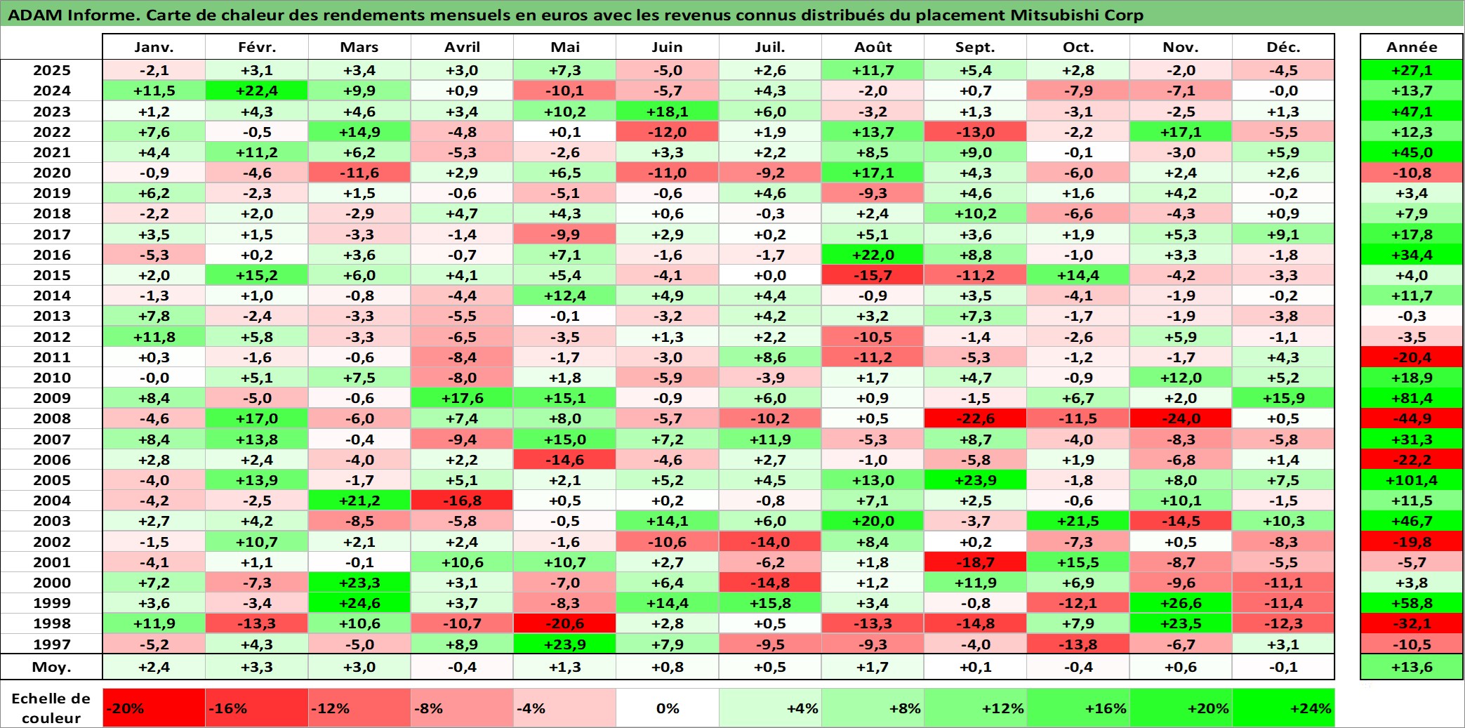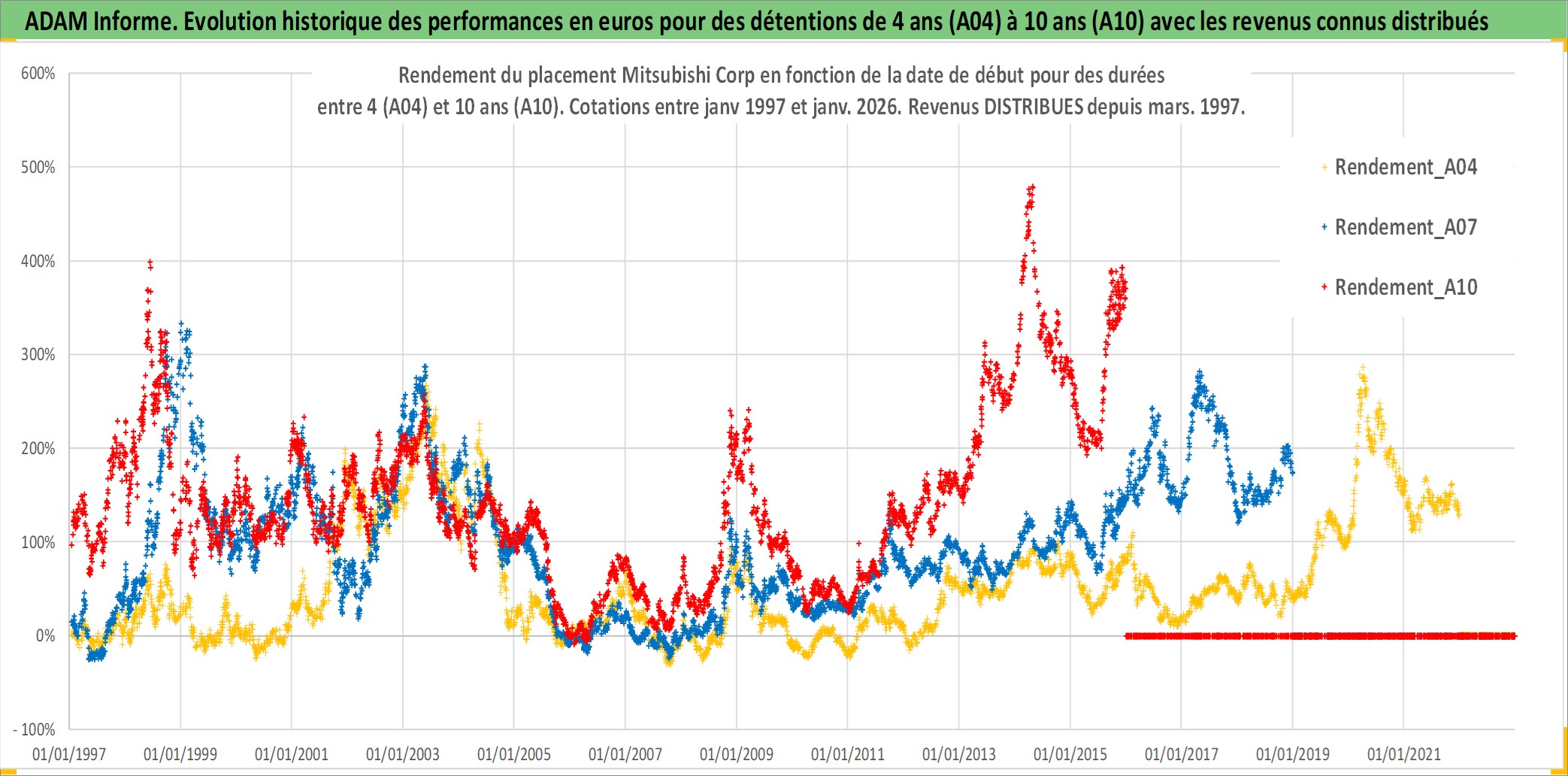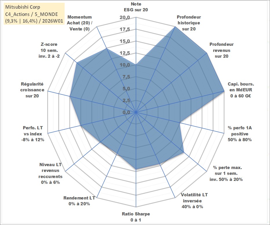 Site dédié aux investisseursPage dédiée sur site financeAnalyse des valorisations hebdomadaires de l'action Mitsubishi Corp. Cet actif est cote en JPY. Les valorisations sont en contrevaleur EURO et couvrent les semaines 1997W01 a 2026W01. Les revenus de cet actif financier sont pris en compte depuis la semaine 1997W13. La note globale ESG de cet actif est estimee a 10.0 (apres rebasage entre 0 et 20).