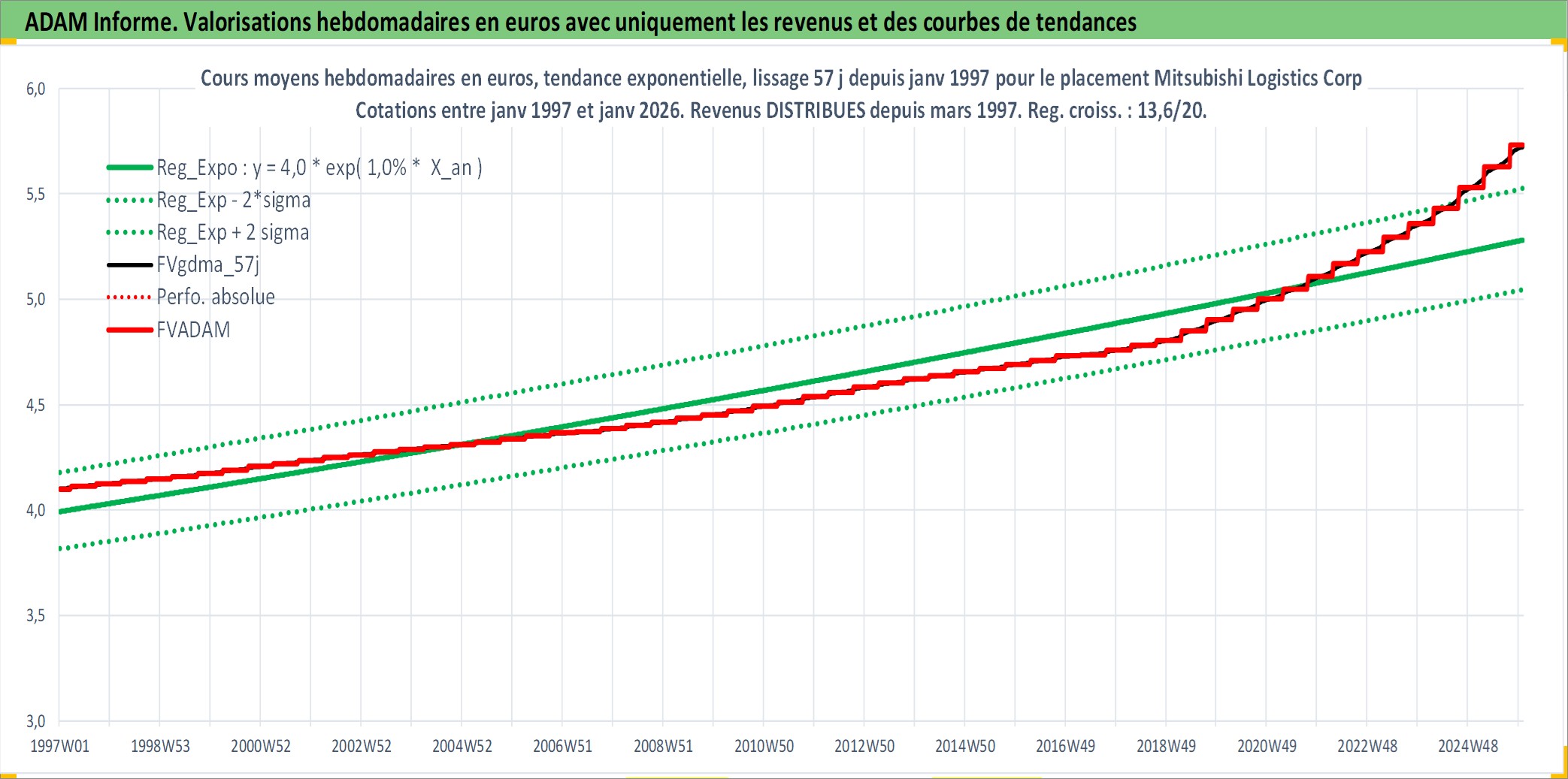 Site dédié aux investisseursPage dédiée sur site financeAnalyse des valorisations hebdomadaires de l'action Mitsubishi Logistics Corp. Cet actif est cote en JPY. Les valorisations sont en contrevaleur EURO et couvrent les semaines 1997W01 a 2026W01. Les revenus de cet actif financier sont pris en compte depuis la semaine 1997W13. La note ESG de cet actif n'est pas connue.