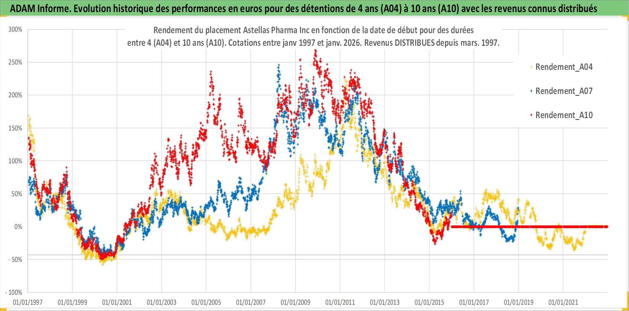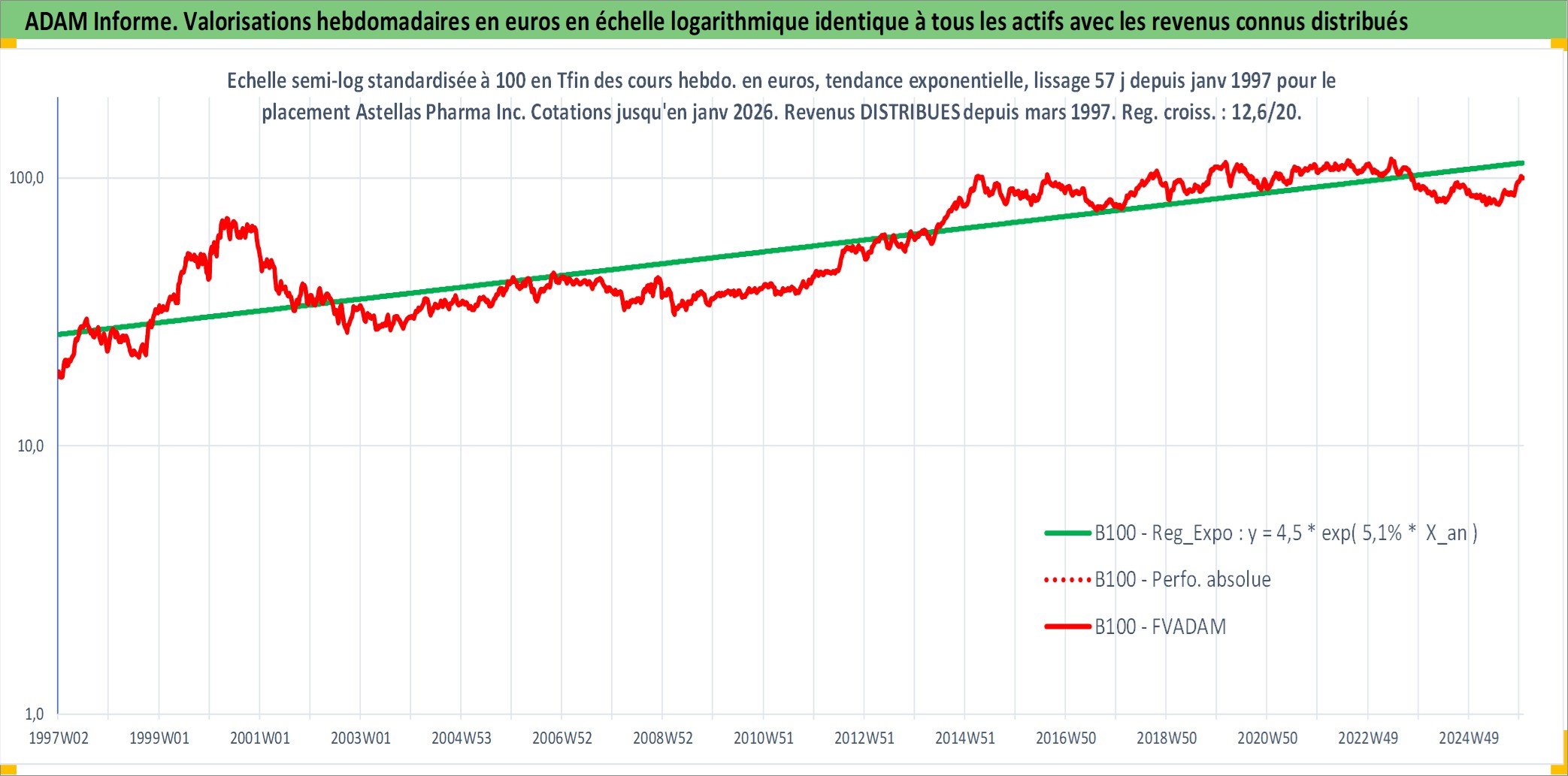 Site dédié aux investisseursPage dédiée sur site financeAnalyse des valorisations hebdomadaires de l'action Astellas Pharma Inc. Cet actif est cote en JPY. Les valorisations sont en contrevaleur EURO et couvrent les semaines 1997W01 a 2026W01. Les revenus de cet actif financier sont pris en compte depuis la semaine 1997W13. La note globale ESG de cet actif est estimee a 10.0 (apres rebasage entre 0 et 20).