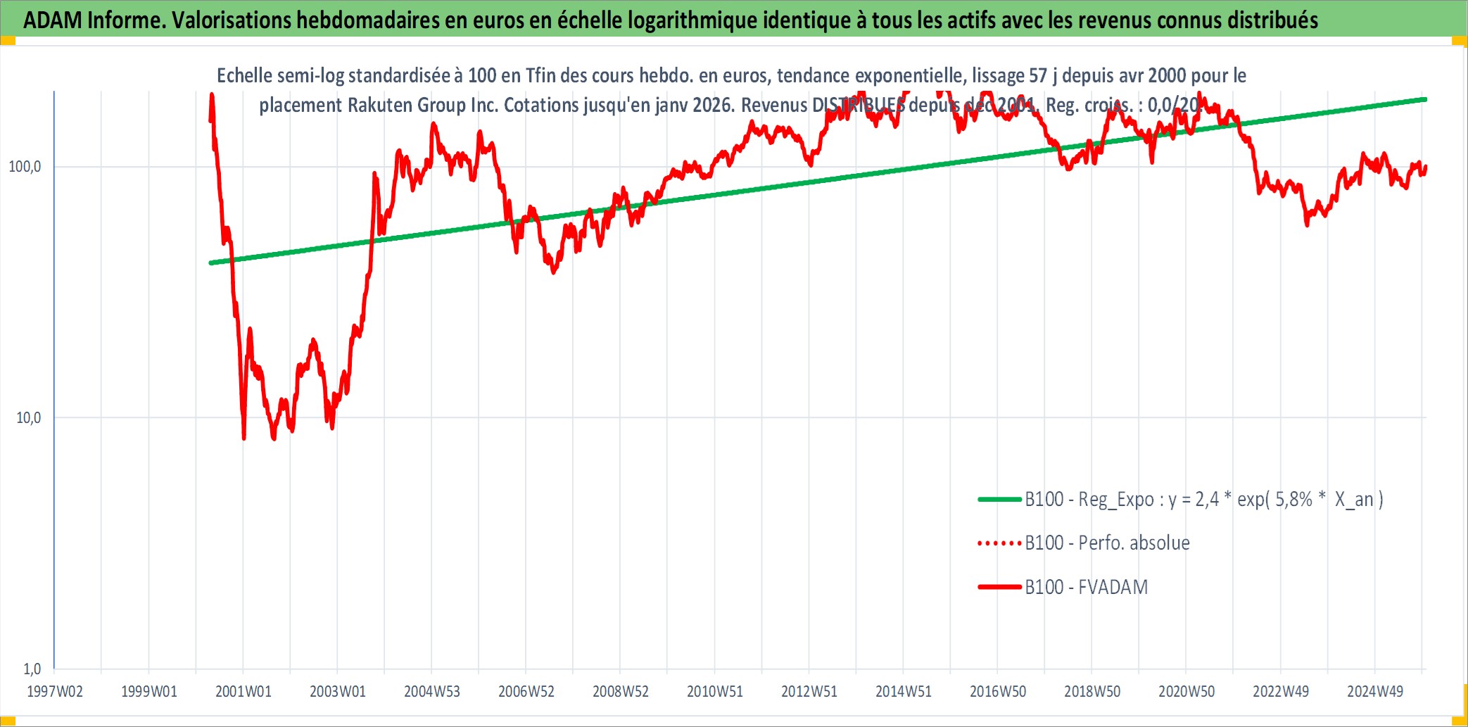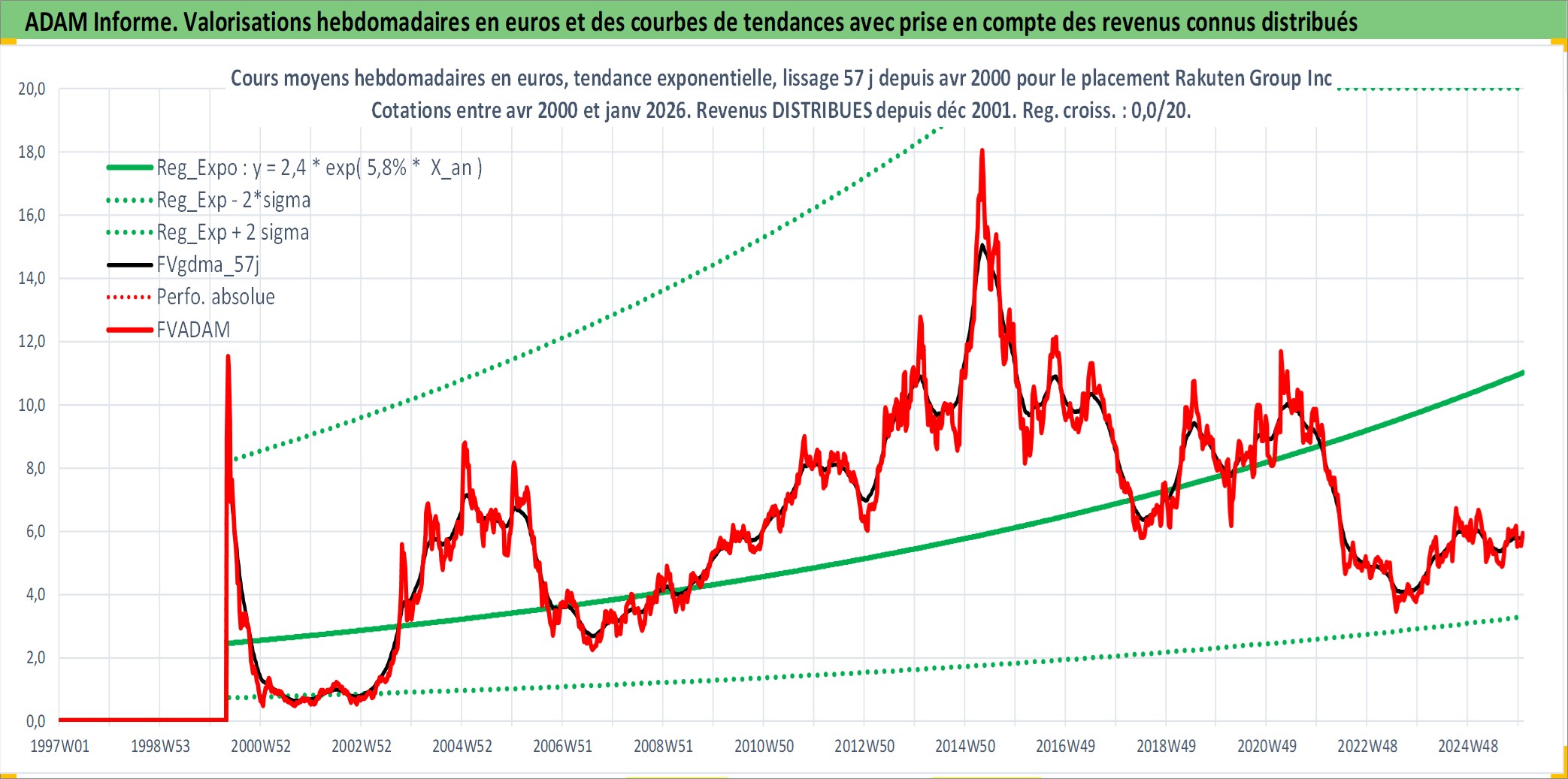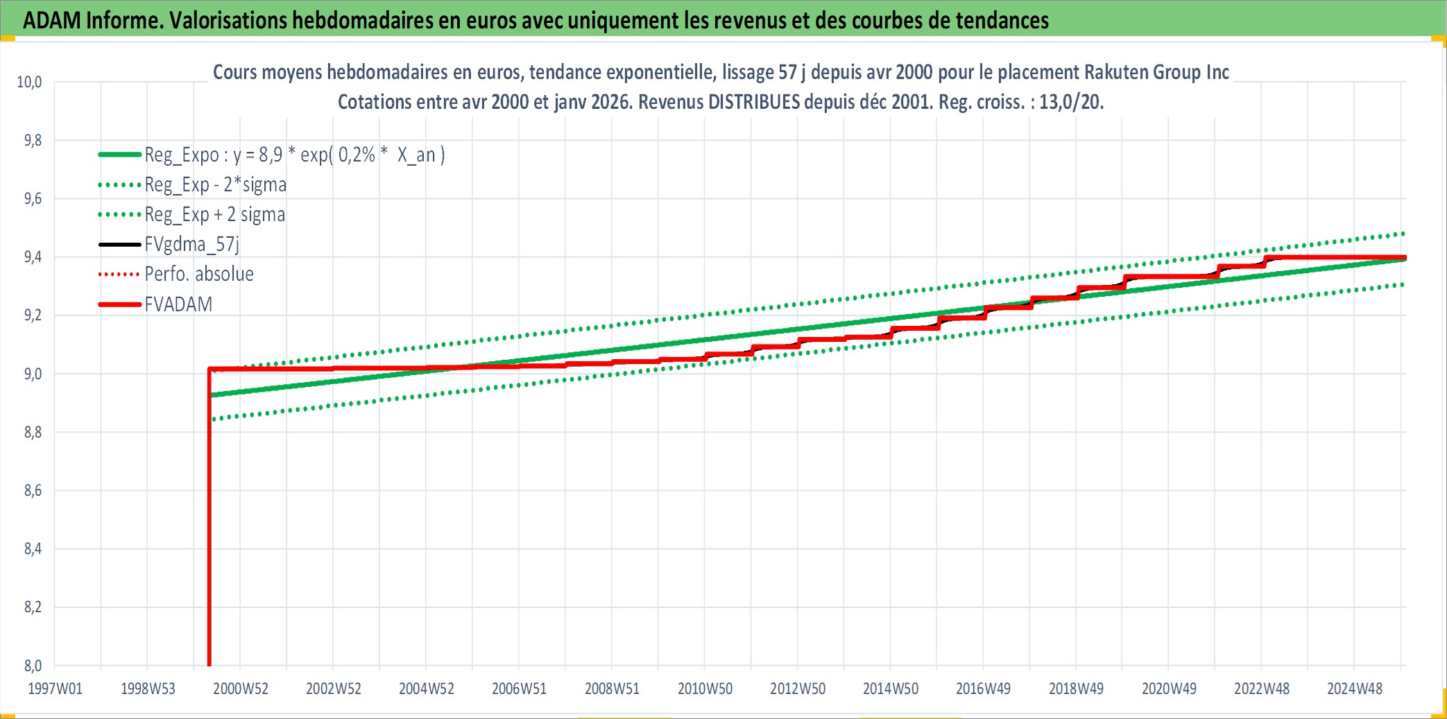 Site dédié aux investisseursPage dédiée sur site financeAnalyse des valorisations hebdomadaires de l'action Rakuten Group Inc. Cet actif est cote en JPY. Les valorisations sont en contrevaleur EURO et couvrent les semaines 2000W17 a 2026W01. Les revenus de cet actif financier sont pris en compte depuis la semaine 2001W52. La note globale ESG de cet actif est estimee a 9.0 (apres rebasage entre 0 et 20).
