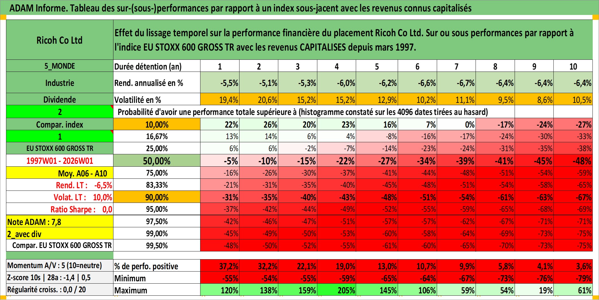 Site dédié aux investisseursPage dédiée sur site financeAnalyse des valorisations hebdomadaires de l'action Ricoh Co Ltd. Cet actif est cote en JPY. Les valorisations sont en contrevaleur EURO et couvrent les semaines 1997W01 a 2026W01. Les revenus de cet actif financier sont pris en compte depuis la semaine 1997W13. La note globale ESG de cet actif est estimee a 11.0 (apres rebasage entre 0 et 20).
