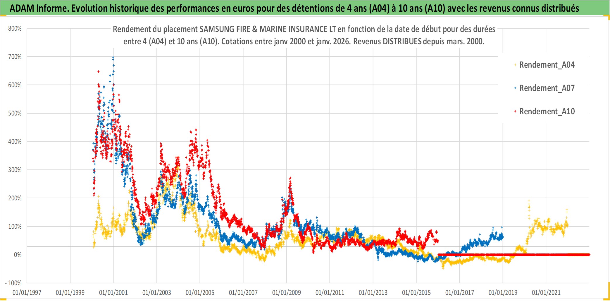Site dédié aux investisseursPage dédiée sur site financeAnalyse des valorisations hebdomadaires de l'action SAMSUNG FIRE & MARINE INSURANCE LT. Cet actif est cote en KRW. Les valorisations sont en contrevaleur EURO et couvrent les semaines 2000W02 a 2026W01. Les revenus de cet actif financier sont pris en compte depuis la semaine 2000W13. La note globale ESG de cet actif est estimee a 10.0 (apres rebasage entre 0 et 20).