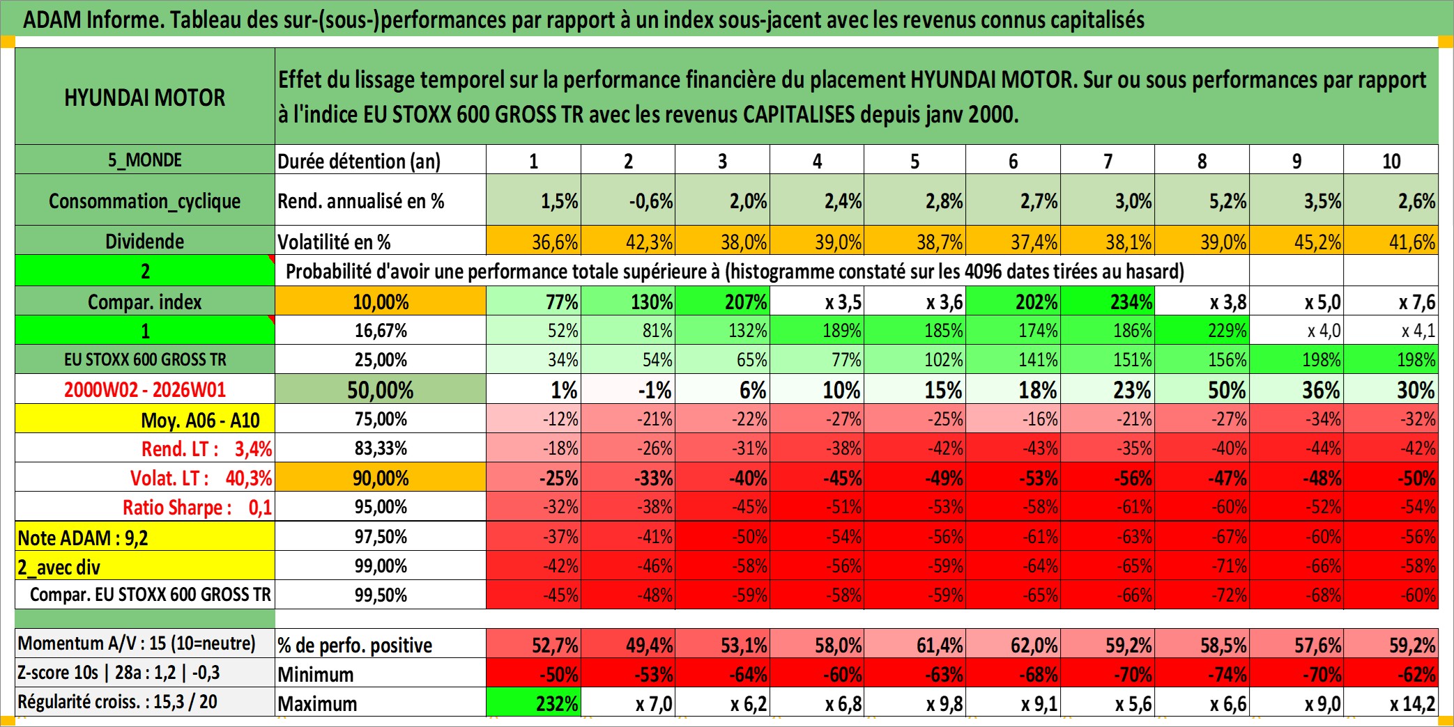 Site dédié aux investisseursPage dédiée sur site financeAnalyse des valorisations hebdomadaires de l'action HYUNDAI MOTOR. Cet actif est cote en KRW. Les valorisations sont en contrevaleur EURO et couvrent les semaines 2000W02 a 2026W01. Les revenus de cet actif financier sont pris en compte depuis la semaine 2000W01. La note globale ESG de cet actif est estimee a 5.0 (apres rebasage entre 0 et 20).