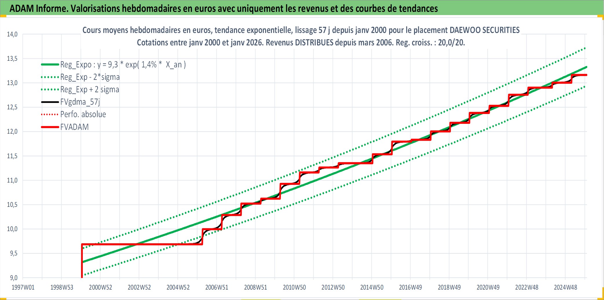 Site dédié aux investisseursPage dédiée sur site financeAnalyse des valorisations hebdomadaires de l'action DAEWOO SECURITIES. Cet actif est cote en KRW. Les valorisations sont en contrevaleur EURO et couvrent les semaines 2000W02 a 2026W01. Les revenus de cet actif financier sont pris en compte depuis la semaine 2006W13. La note globale ESG de cet actif est estimee a 8.0 (apres rebasage entre 0 et 20).