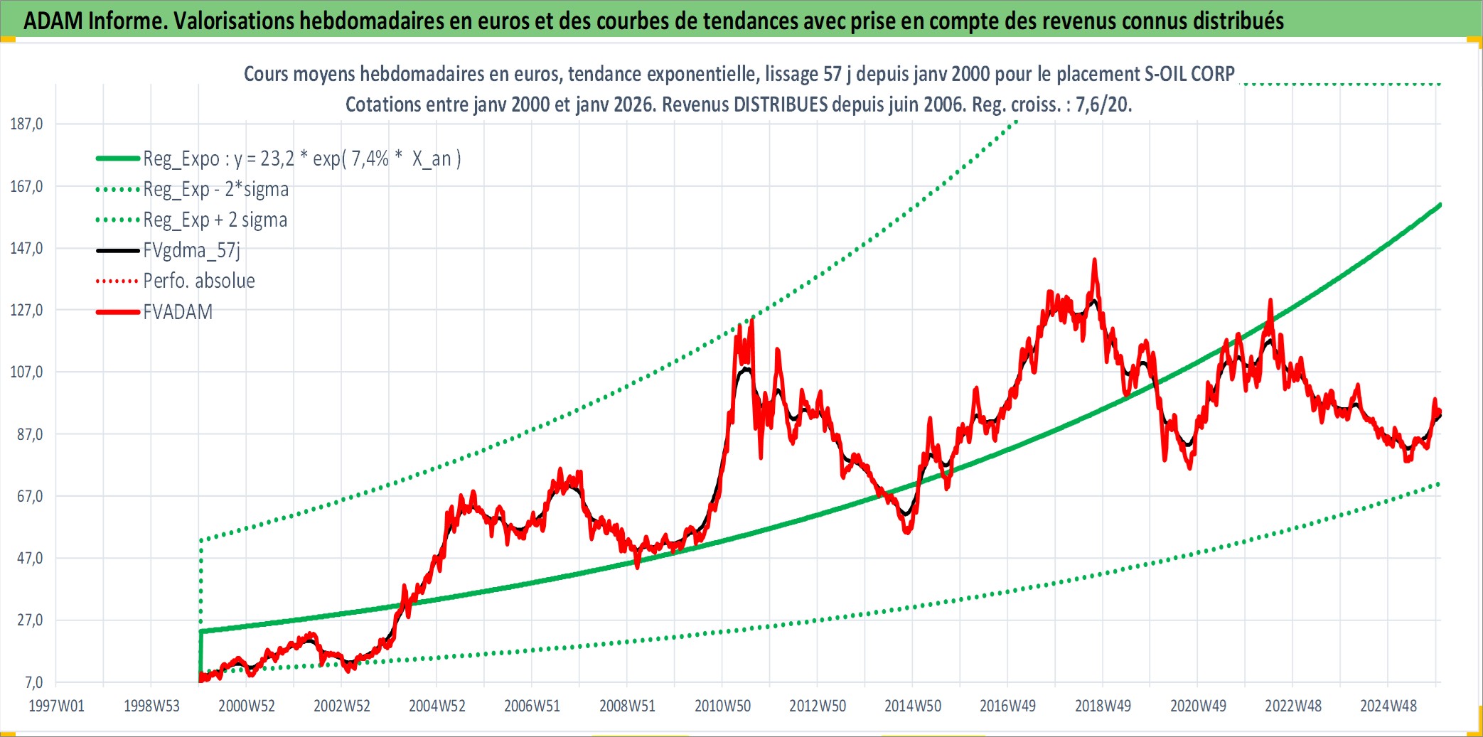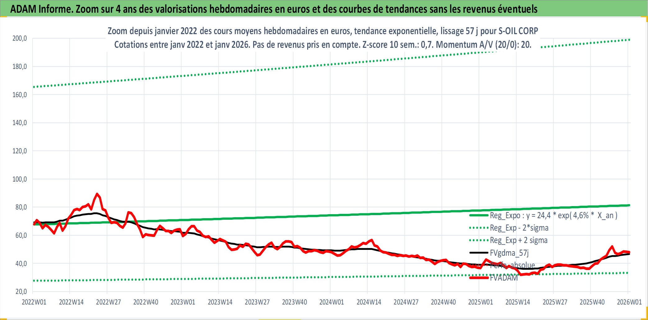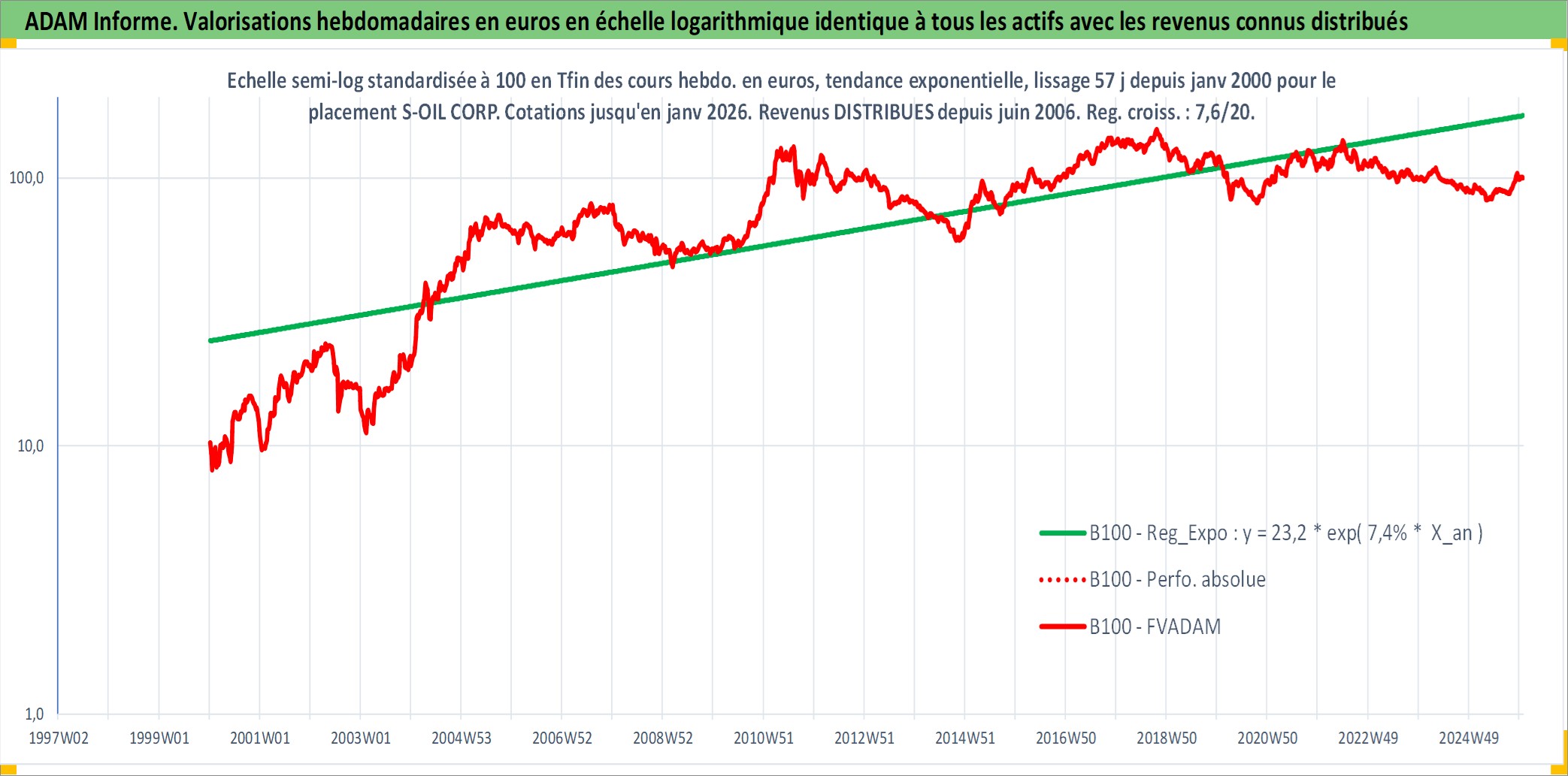 Site dédié aux investisseursPage dédiée sur site financeAnalyse des valorisations hebdomadaires de l'action S-OIL CORP. Cet actif est cote en KRW. Les valorisations sont en contrevaleur EURO et couvrent les semaines 2000W02 a 2026W01. Les revenus de cet actif financier sont pris en compte depuis la semaine 2006W26. La note globale ESG de cet actif est estimee a 4.0 (apres rebasage entre 0 et 20).