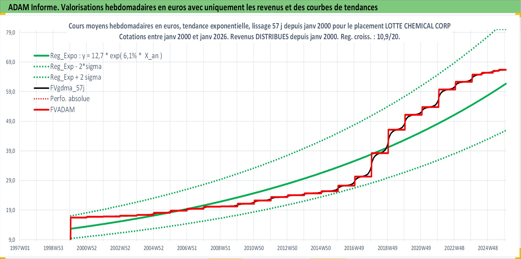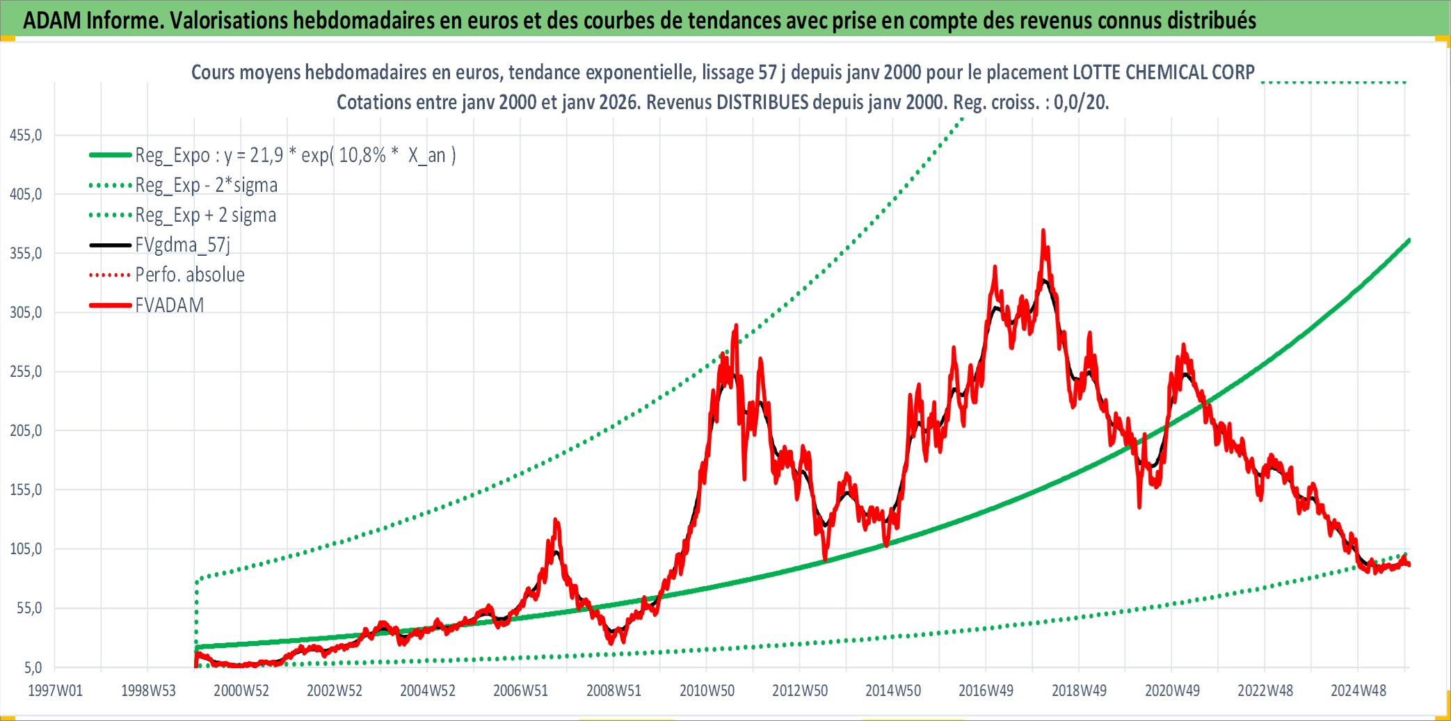 Site dédié aux investisseursPage dédiée sur site financeAnalyse des valorisations hebdomadaires de l'action LOTTE CHEMICAL CORP. Cet actif est cote en KRW. Les valorisations sont en contrevaleur EURO et couvrent les semaines 2000W02 a 2026W01. Les revenus de cet actif financier sont pris en compte depuis la semaine 2000W01. La note globale ESG de cet actif est estimee a 6.0 (apres rebasage entre 0 et 20).
