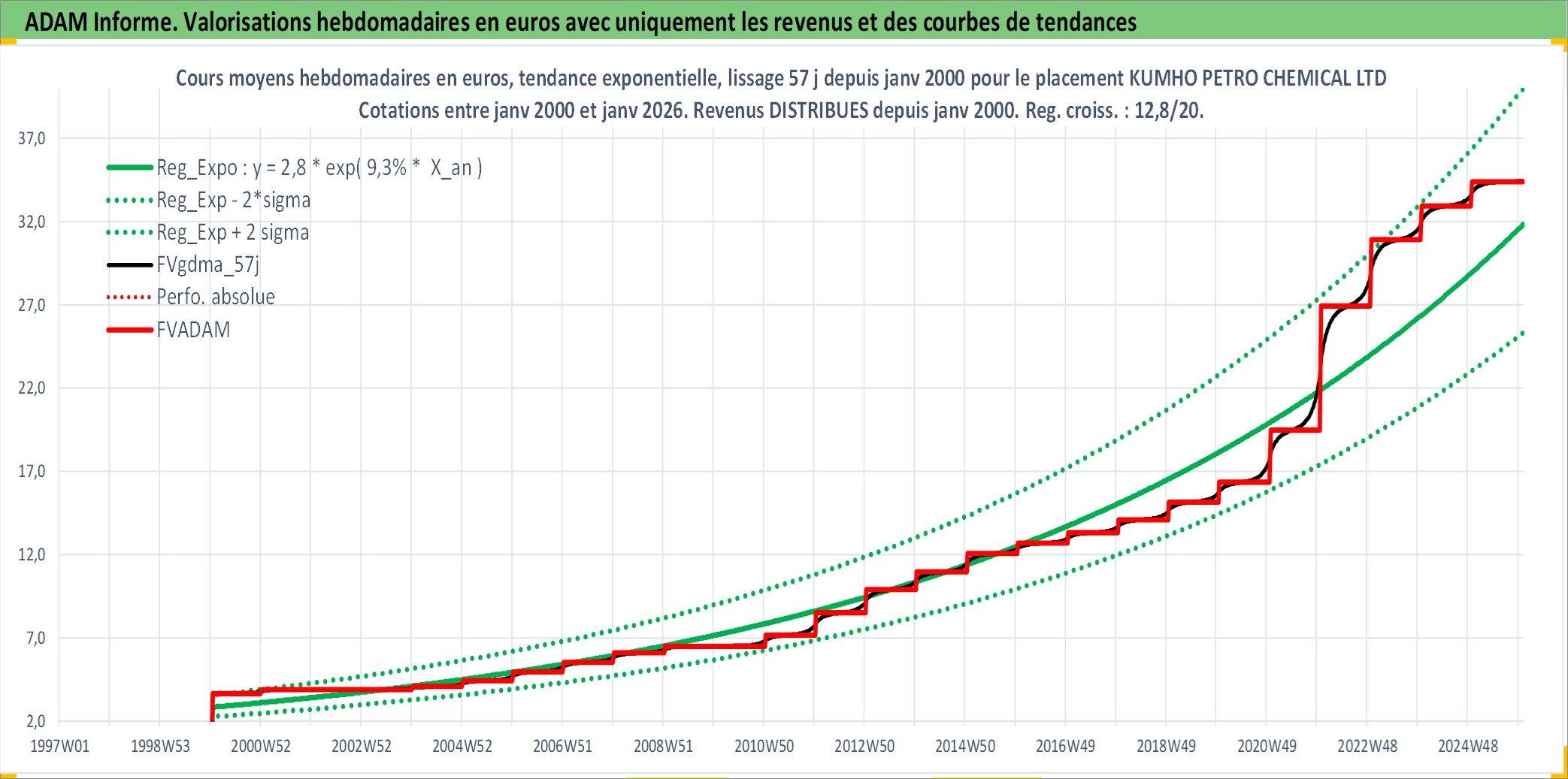 Site dédié aux investisseursPage dédiée sur site financeAnalyse des valorisations hebdomadaires de l'action KUMHO PETRO CHEMICAL LTD. Cet actif est cote en KRW. Les valorisations sont en contrevaleur EURO et couvrent les semaines 2000W02 a 2026W01. Les revenus de cet actif financier sont pris en compte depuis la semaine 2000W01. La note ESG de cet actif n'est pas connue.
