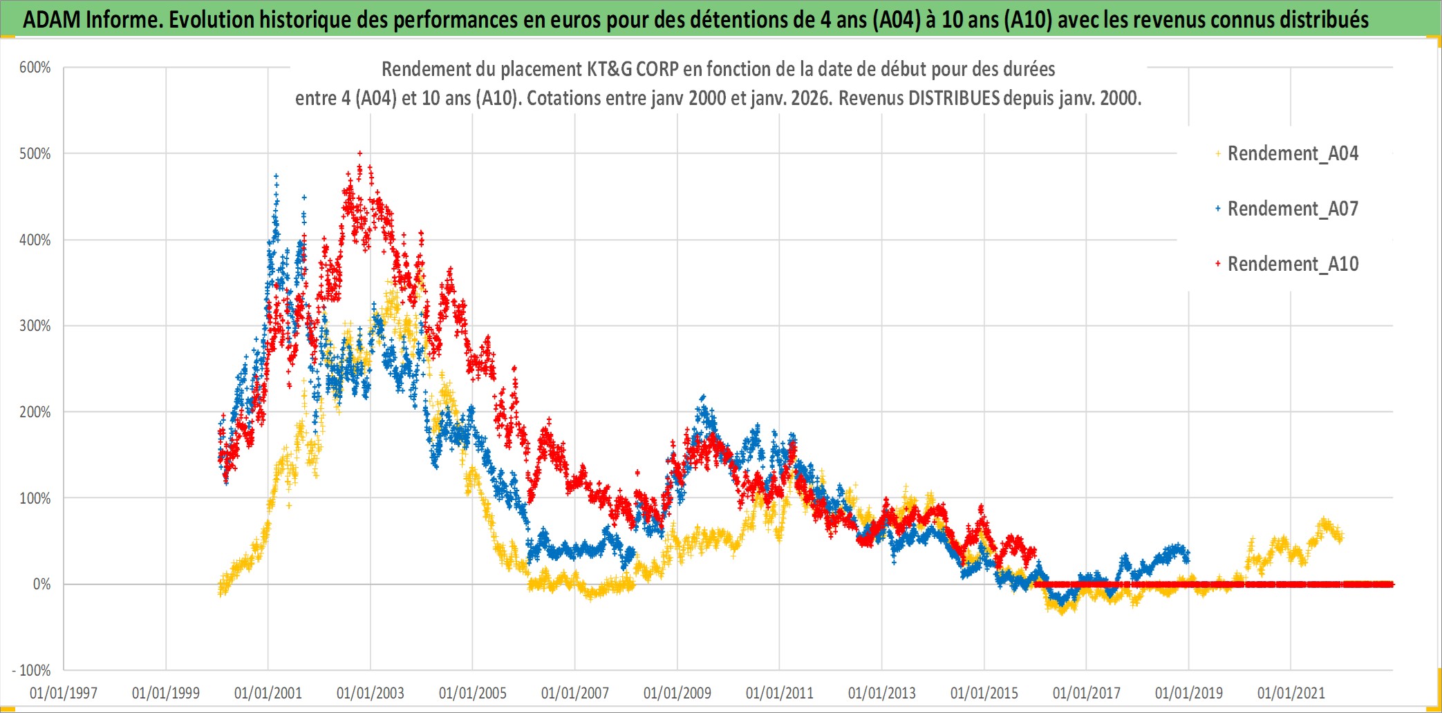 Site dédié aux investisseursPage dédiée sur site financeAnalyse des valorisations hebdomadaires de l'action KT&G CORP. Cet actif est cote en KRW. Les valorisations sont en contrevaleur EURO et couvrent les semaines 2000W02 a 2026W01. Les revenus de cet actif financier sont pris en compte depuis la semaine 2000W01. La note globale ESG de cet actif est estimee a 5.0 (apres rebasage entre 0 et 20).