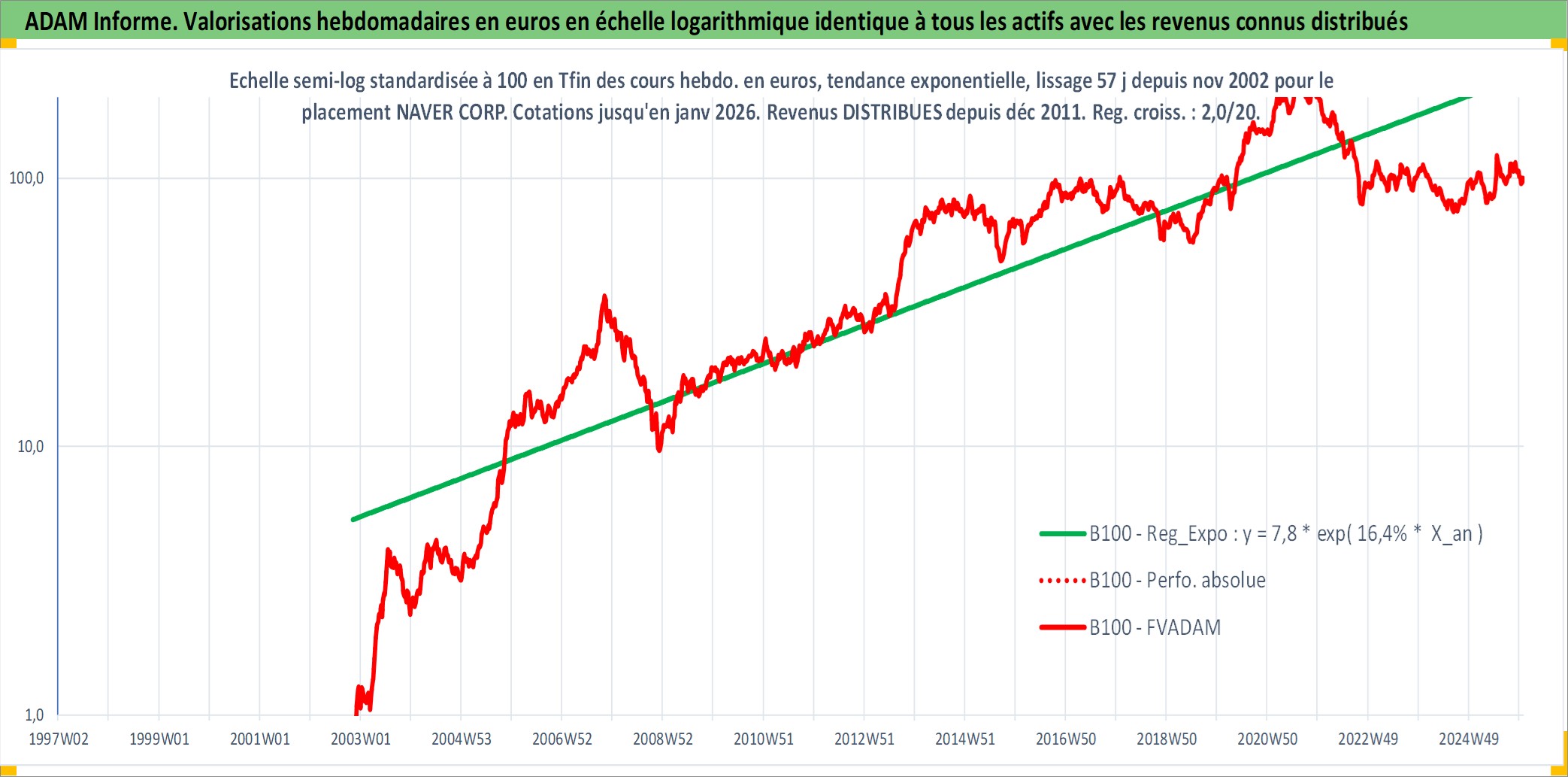Site dédié aux investisseursPage dédiée sur site financeAnalyse des valorisations hebdomadaires de l'action NAVER CORP. Cet actif est cote en KRW. Les valorisations sont en contrevaleur EURO et couvrent les semaines 2002W45 a 2026W01. Les revenus de cet actif financier sont pris en compte depuis la semaine 2011W52. La note globale ESG de cet actif est estimee a 13.0 (apres rebasage entre 0 et 20).