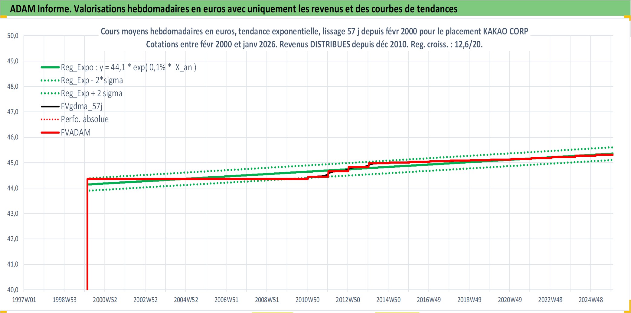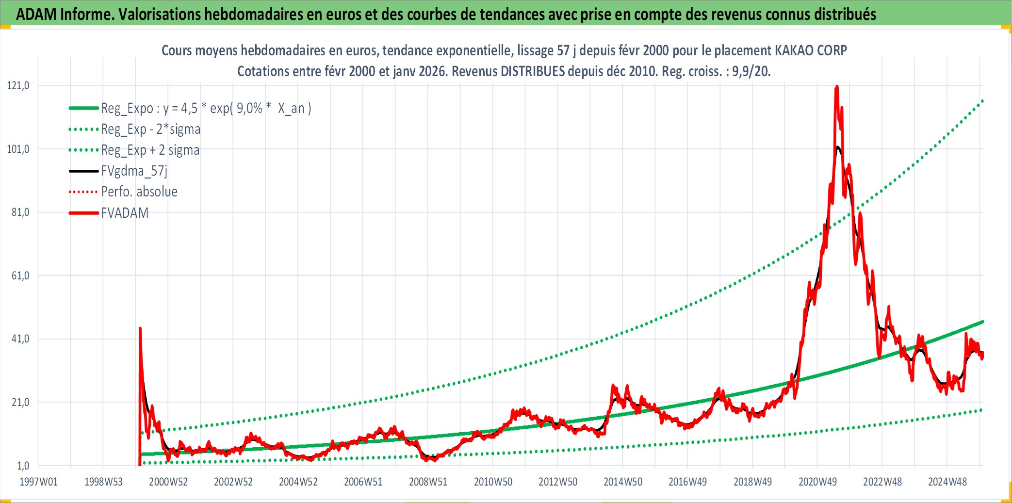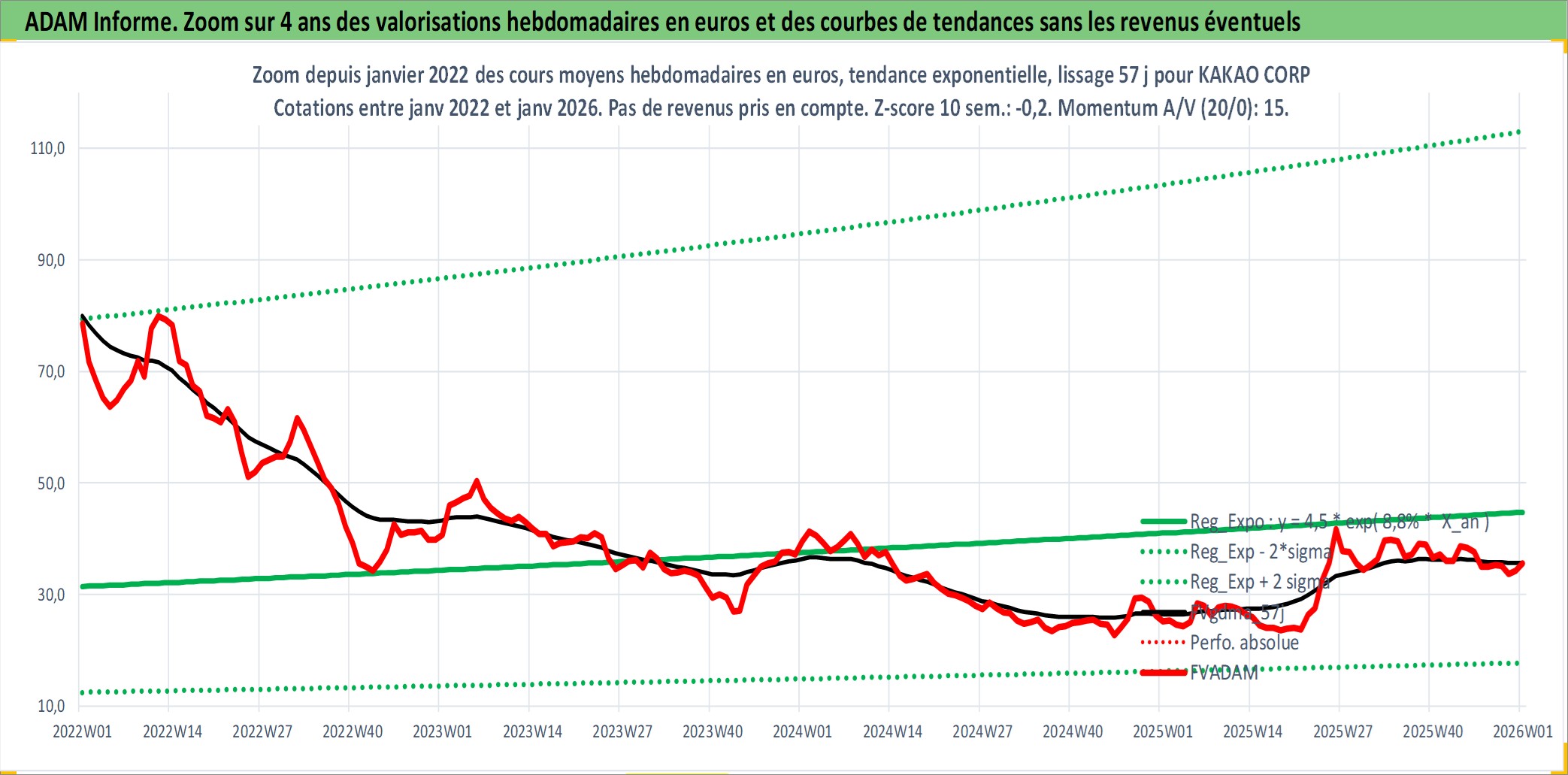 Site dédié aux investisseursPage dédiée sur site financeAnalyse des valorisations hebdomadaires de l'action KAKAO CORP. Cet actif est cote en KRW. Les valorisations sont en contrevaleur EURO et couvrent les semaines 2000W07 a 2026W01. Les revenus de cet actif financier sont pris en compte depuis la semaine 2010W52. La note globale ESG de cet actif est estimee a 7.0 (apres rebasage entre 0 et 20).