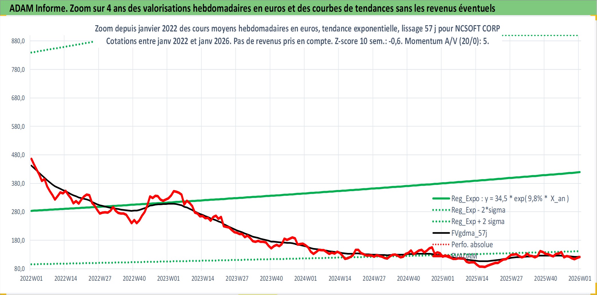 Site dédié aux investisseursPage dédiée sur site financeAnalyse des valorisations hebdomadaires de l'action NCSOFT CORP. Cet actif est cote en KRW. Les valorisations sont en contrevaleur EURO et couvrent les semaines 2000W29 a 2026W01. Les revenus de cet actif financier sont pris en compte depuis la semaine 2008W13. La note globale ESG de cet actif est estimee a 15.0 (apres rebasage entre 0 et 20).