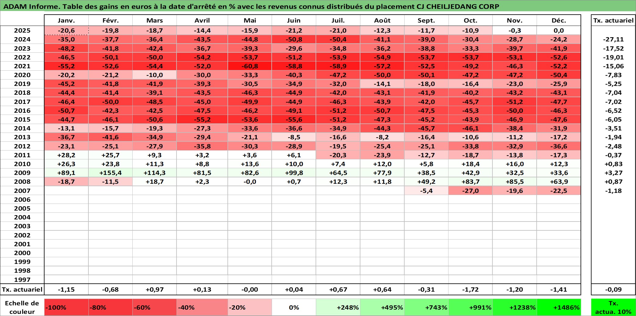 Site dédié aux investisseursPage dédiée sur site financeAnalyse des valorisations hebdomadaires de l'action CJ CHEILJEDANG CORP. Cet actif est cote en KRW. Les valorisations sont en contrevaleur EURO et couvrent les semaines 2007W40 a 2026W01. Les revenus de cet actif financier sont pris en compte depuis la semaine 2009W01. La note ESG de cet actif n'est pas connue.