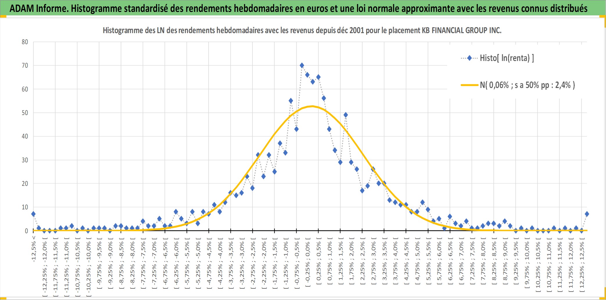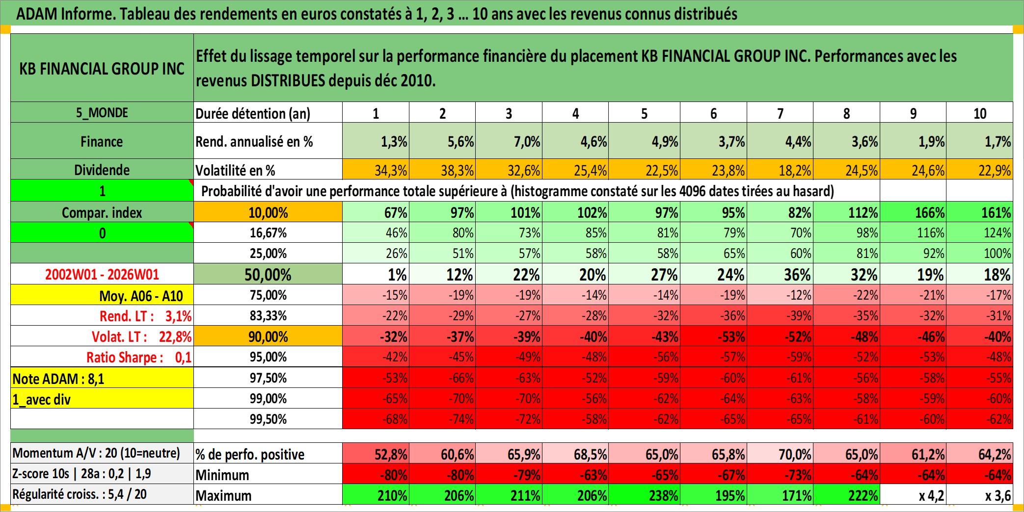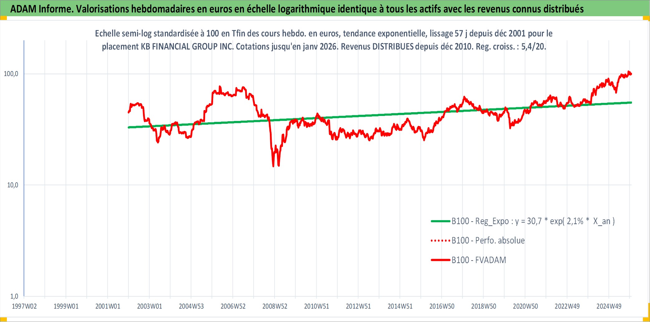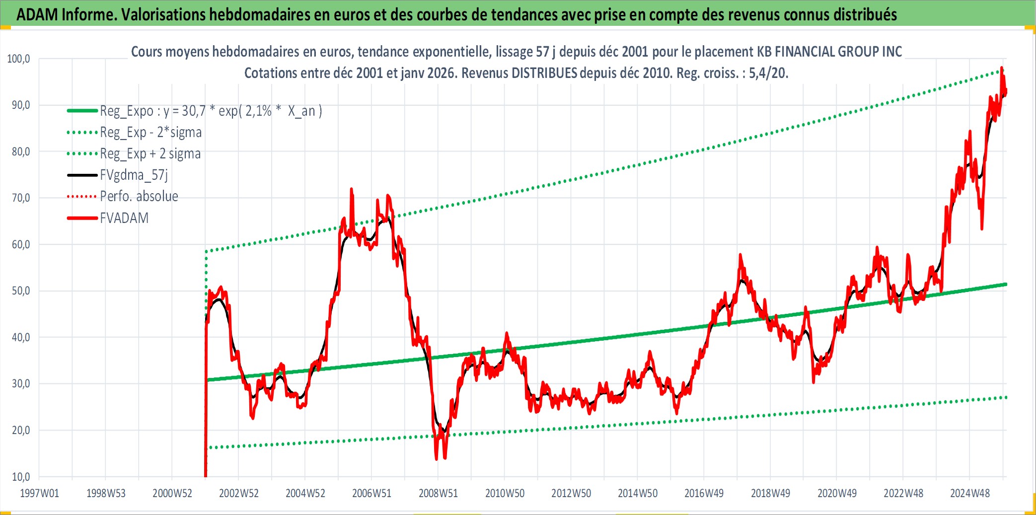 Site dédié aux investisseursPage dédiée sur site financeAnalyse des valorisations hebdomadaires de l'action KB FINANCIAL GROUP INC. Cet actif est cote en KRW. Les valorisations sont en contrevaleur EURO et couvrent les semaines 2002W01 a 2026W01. Les revenus de cet actif financier sont pris en compte depuis la semaine 2010W52. La note globale ESG de cet actif est estimee a 6.0 (apres rebasage entre 0 et 20).