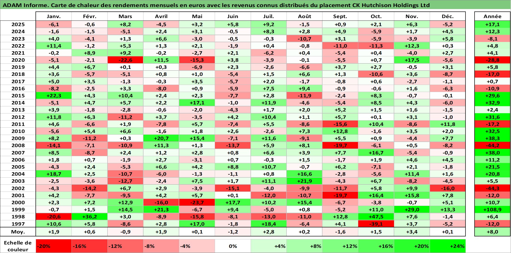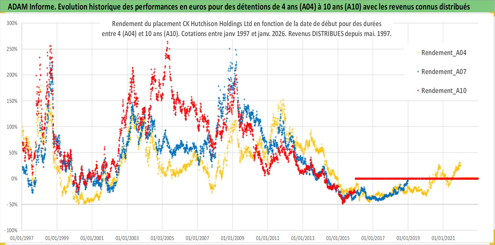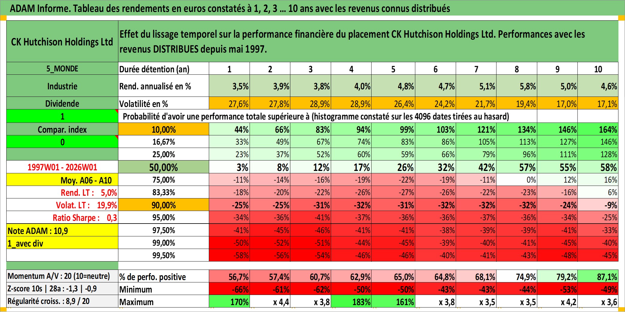 Site dédié aux investisseursPage dédiée sur site financeAnalyse des valorisations hebdomadaires de l'action CK Hutchison Holdings Ltd. Cet actif est cote en HKD. Les valorisations sont en contrevaleur EURO et couvrent les semaines 1997W01 a 2026W01. Les revenus de cet actif financier sont pris en compte depuis la semaine 1997W21. La note globale ESG de cet actif est estimee a 6.0 (apres rebasage entre 0 et 20).