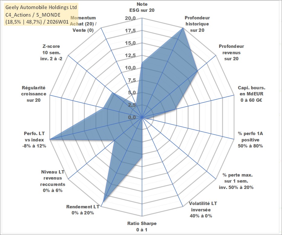 Site dédié aux investisseursPage dédiée sur site financeAnalyse des valorisations hebdomadaires de l'action Geely Automobile Holdings Ltd. Cet actif est cote en HKD. Les valorisations sont en contrevaleur EURO et couvrent les semaines 1997W01 a 2026W01. Les revenus de cet actif financier sont pris en compte depuis la semaine 2005W20. La note globale ESG de cet actif est estimee a 11.0 (apres rebasage entre 0 et 20).