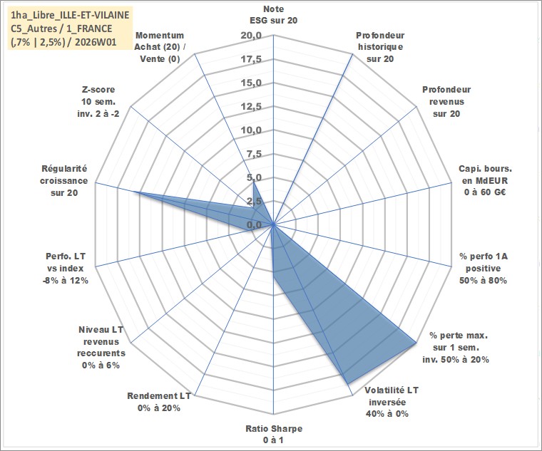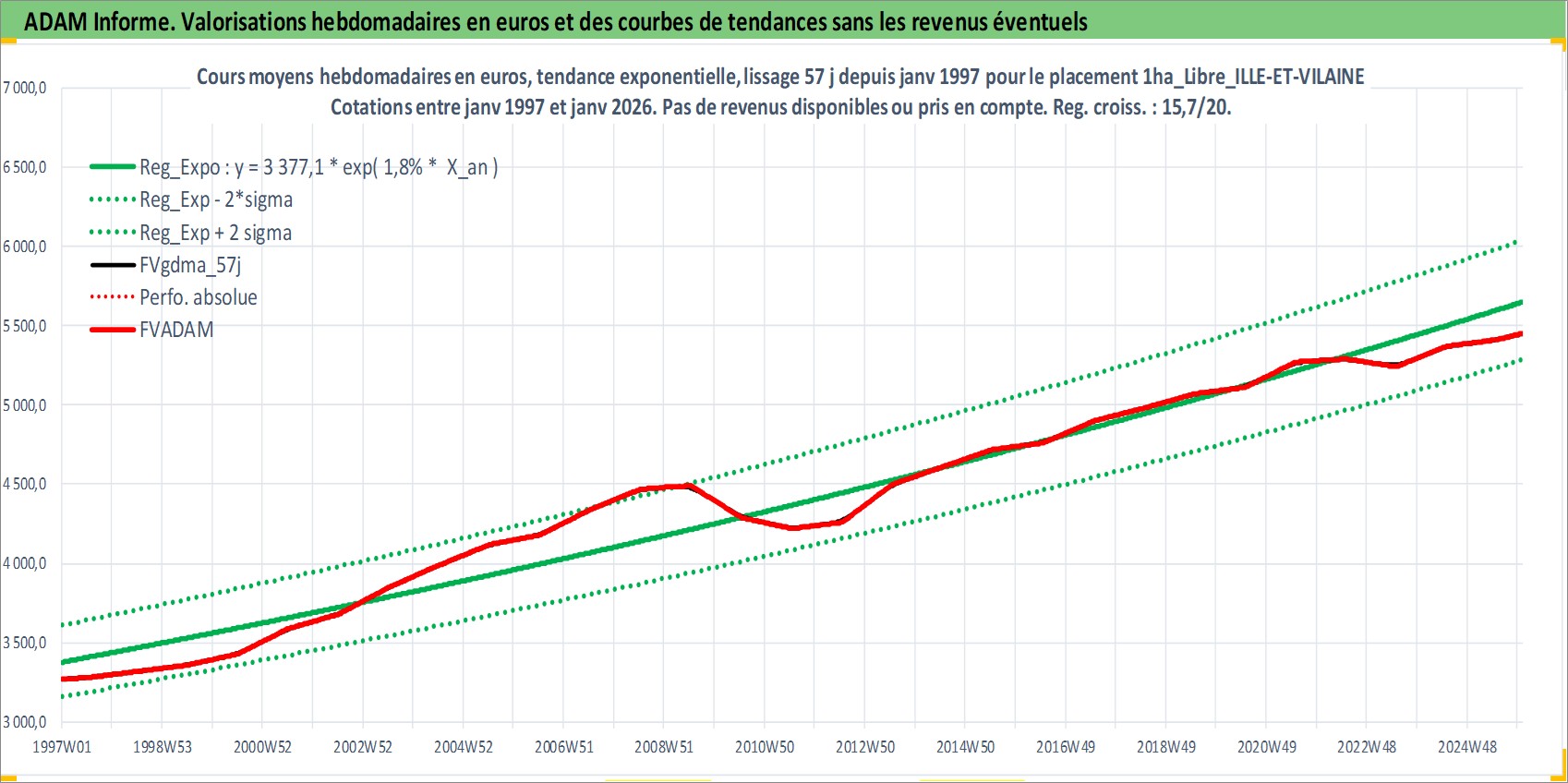 Site dédié aux investisseursPage dédiée sur site financeAnalyse des valorisations hebdomadaires de l'actif 1ha_Libre_ILLE-ET-VILAINE. Cet actif est cote en EUR. Les valorisations couvrent les semaines 1997W01 a 2026W01. Les fermages de ce bien foncier sont pris egaux a 2,5% annuels de la valeur venale du bien.