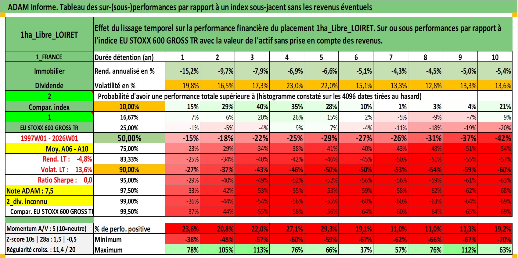 Site dédié aux investisseursPage dédiée sur site financeAnalyse des valorisations hebdomadaires de l'actif 1ha_Libre_LOIRET. Cet actif est cote en EUR. Les valorisations couvrent les semaines 1997W01 a 2026W01. Les fermages de ce bien foncier sont pris egaux a 2,5% annuels de la valeur venale du bien.