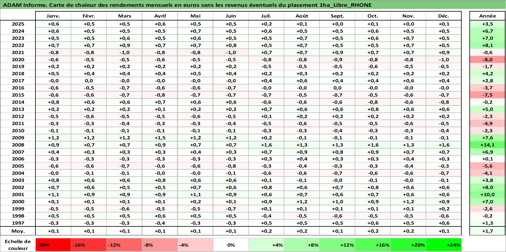 Site dédié aux investisseursPage dédiée sur site financeAnalyse des valorisations hebdomadaires de l'actif 1ha_Libre_RHONE. Cet actif est cote en EUR. Les valorisations couvrent les semaines 1997W01 a 2026W01. Les fermages de ce bien foncier sont pris egaux a 2,5% annuels de la valeur venale du bien.