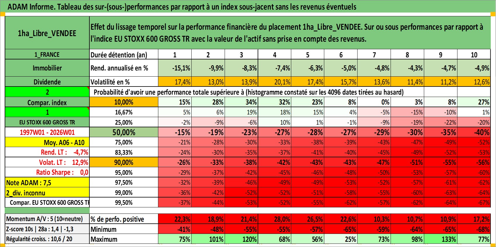 Site dédié aux investisseursPage dédiée sur site financeAnalyse des valorisations hebdomadaires de l'actif 1ha_Libre_VENDEE. Cet actif est cote en EUR. Les valorisations couvrent les semaines 1997W01 a 2026W01. Les fermages de ce bien foncier sont pris egaux a 2,5% annuels de la valeur venale du bien.