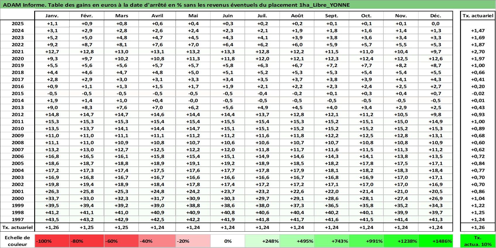 Site dédié aux investisseursPage dédiée sur site financeAnalyse des valorisations hebdomadaires de l'actif 1ha_Libre_YONNE. Cet actif est cote en EUR. Les valorisations couvrent les semaines 1997W01 a 2026W01. Les fermages de ce bien foncier sont pris egaux a 2,5% annuels de la valeur venale du bien.